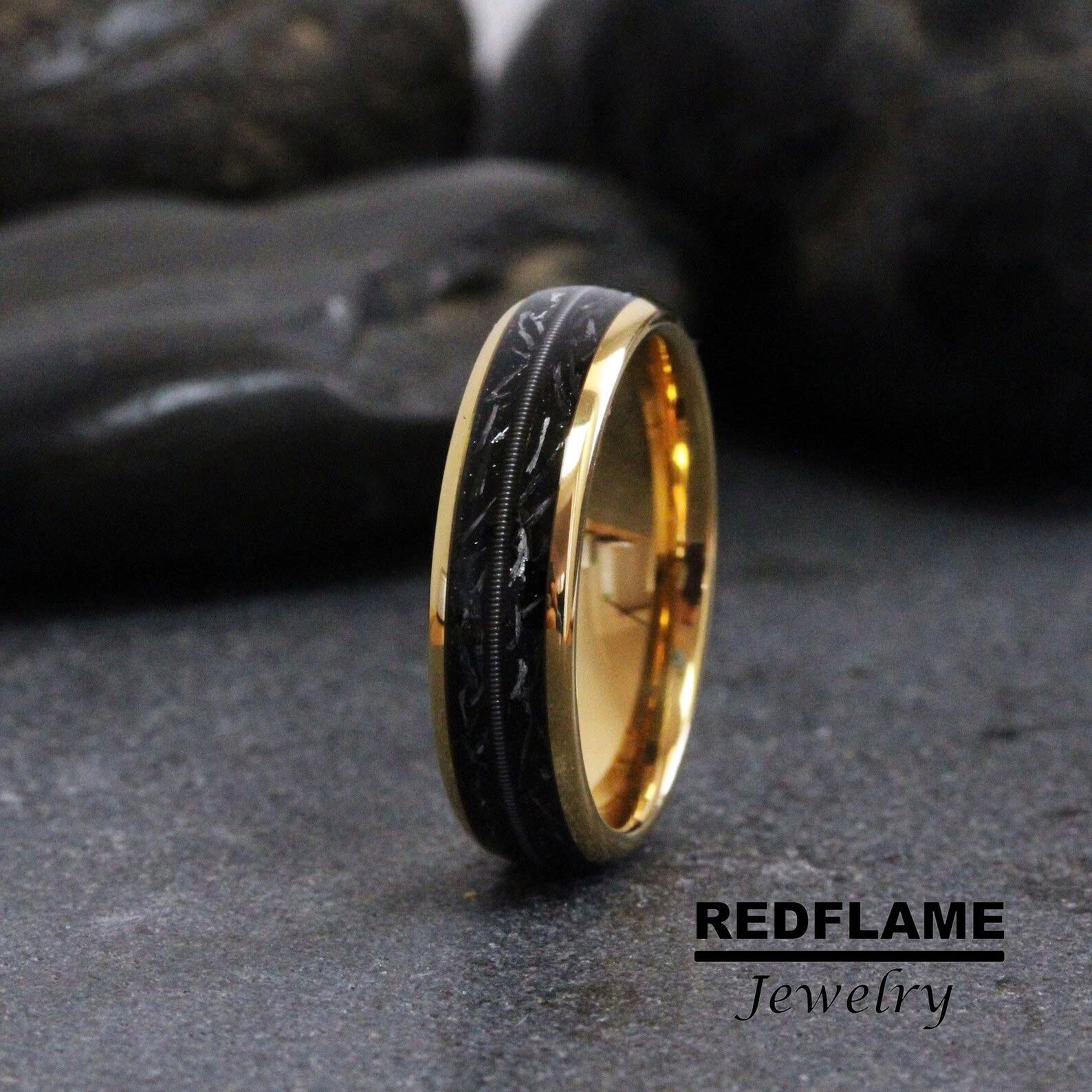 Guitar String Meteorite Yellow Gold Tungsten Carbide Rings - Custom Order