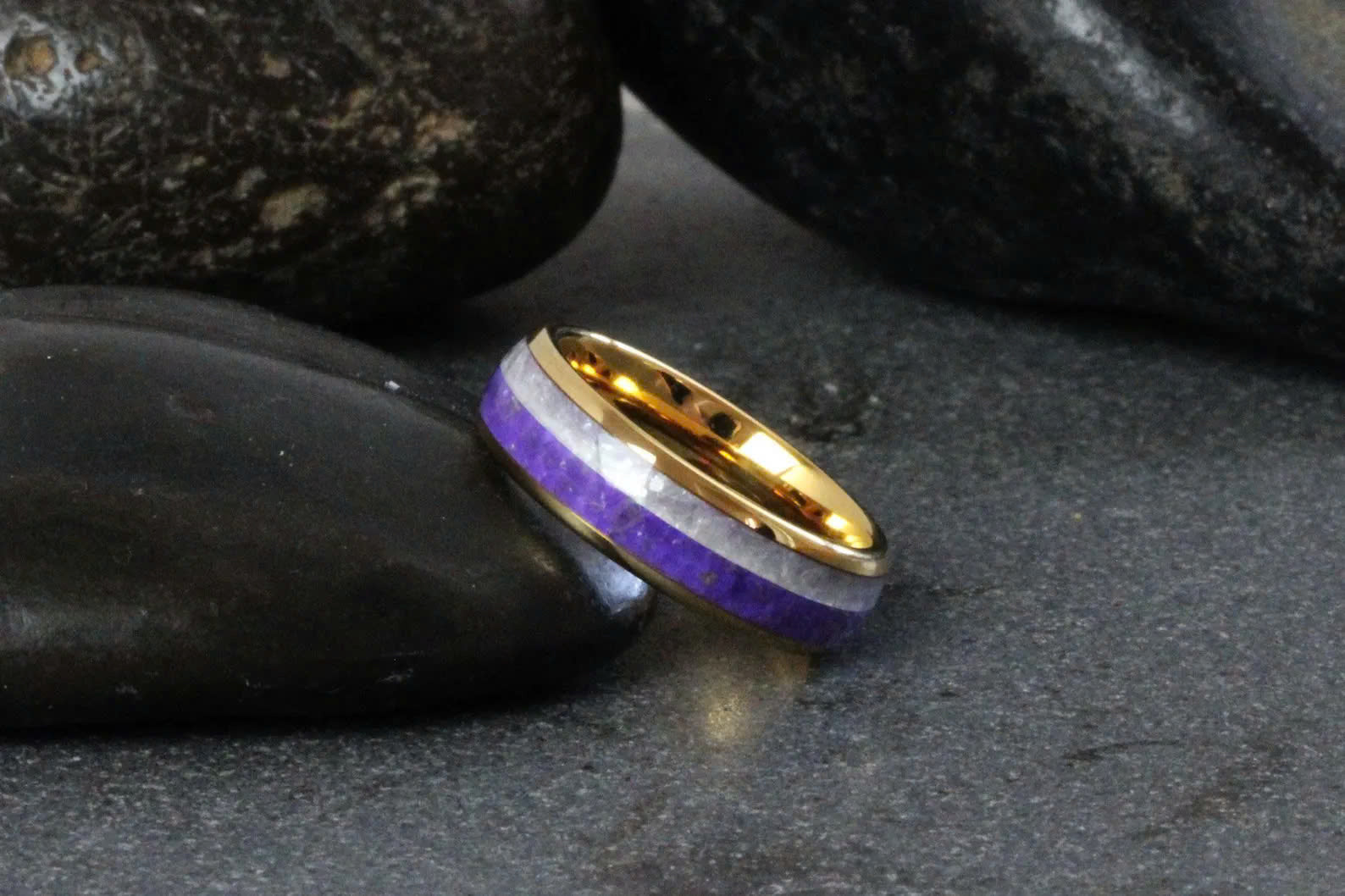 Koa Wood Amethyst Yellow Gold Tungsten Ring- Custom Order