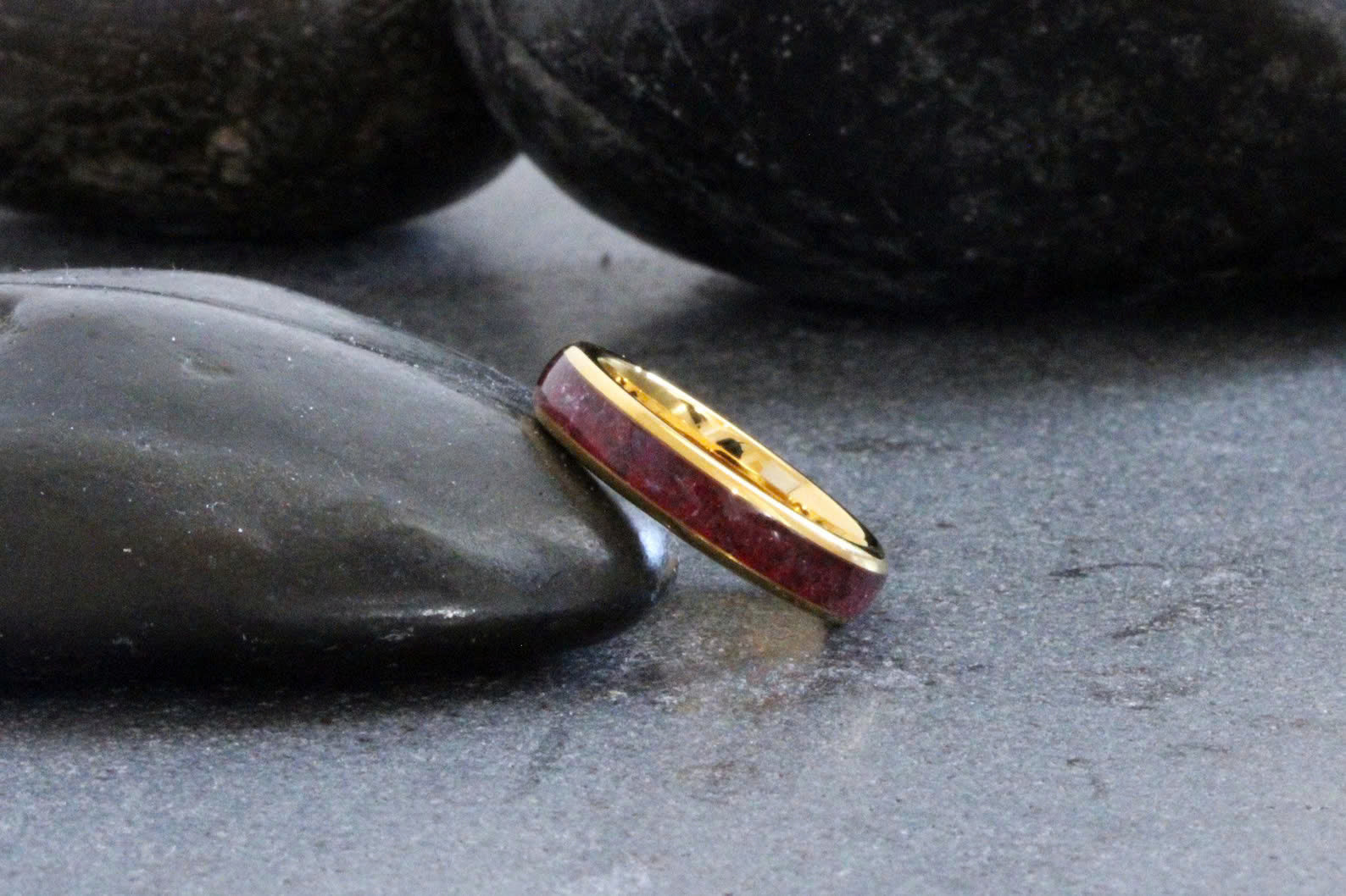 Red Garnet Crushed Yellow Gold Tungsten Carbide Rings - Custom Order