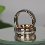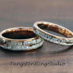 An amazing combination of Genuine Natural-Shed Deer Elk Antler, Rose Gold Arrows and Imitated Meteorite creates the desired wedding ring, anniversary ring for couples. These rings are made of the best Deer Elk Antler, radiant silver meteorite, and high-quality Tungsten Carbide. The Antler layer was carefully peeled into a thin layer, then both Antler and Meteorite inlaid over the groove of the tungsten setting, and finally covered with our protective armor layer that shields it from water, dirt, and grime in order to protect the inlays inside. The rings look great for every day or on your occasions.
