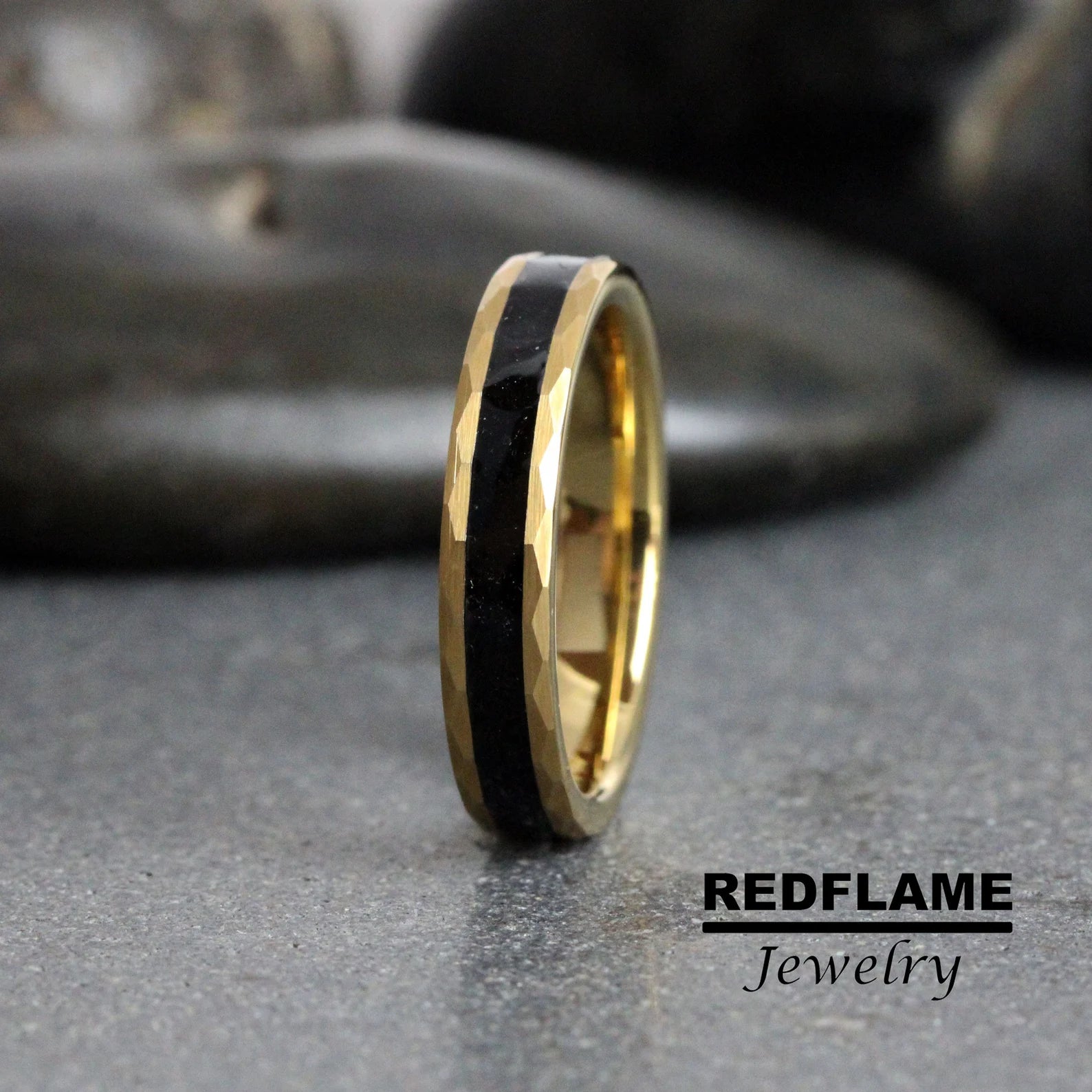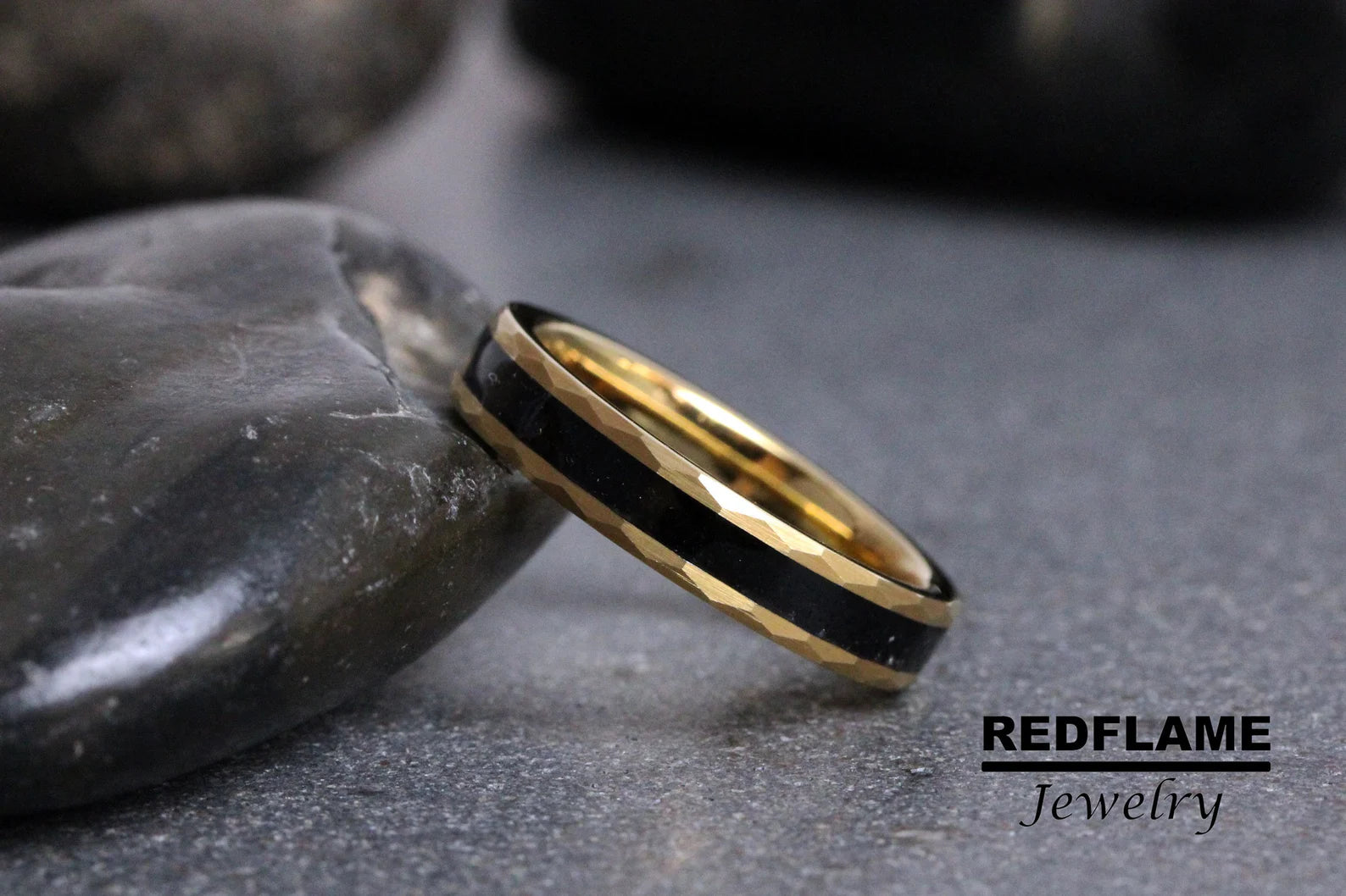 Hammer Gold Black Tourmaline Crushed Wedding Ring, Rose Black Yellow Silver Gray Tungsten Wedding Ring, Mens Ring Custom Order