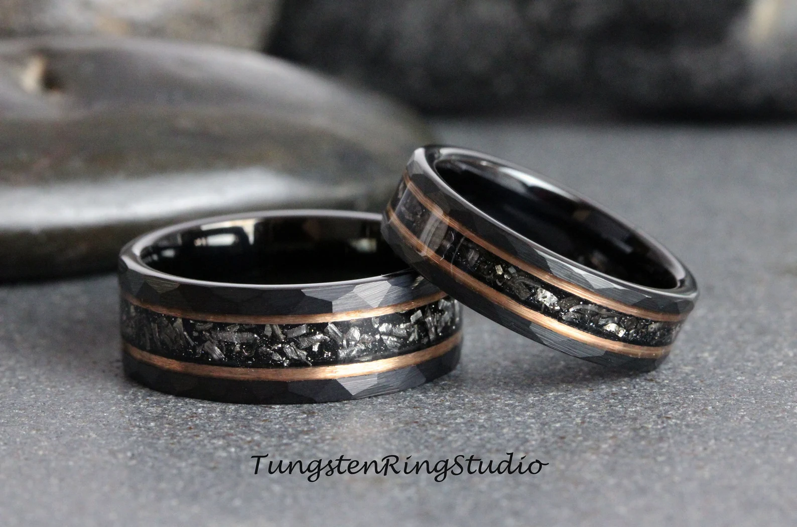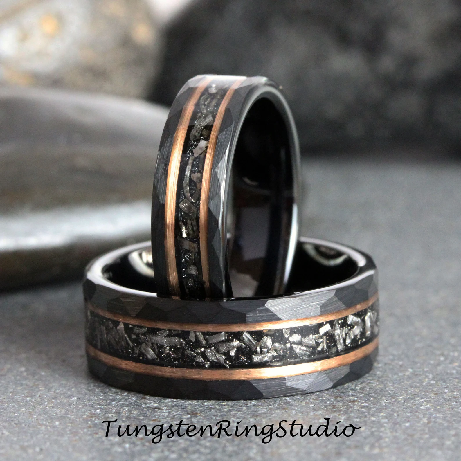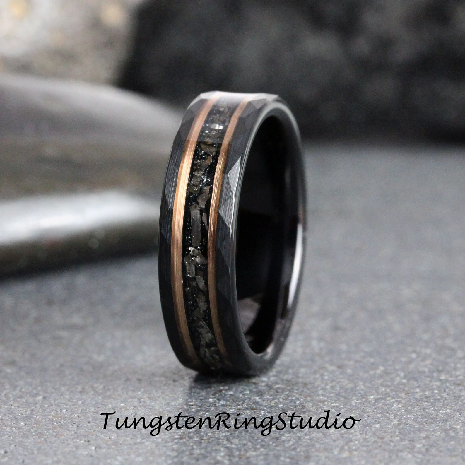 Meteorite Rose Gold Strip Hammered Tungsten Carbide Ring – TungstenRingStudio
