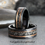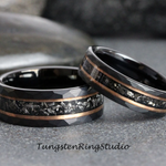 The unique Authentic Gibeon Meteorite Debris and Rose Gold Strip with Black Tungsten create the desired wedding ring, an anniversary ring for couples. The Meteorite was inlaid over the groove of the tungsten setting and finally covered with our protective armor layer that shields it from water, dirt, and grime in order to protect the inlays inside. The rings look great for every day or on your occasions.
