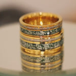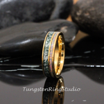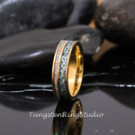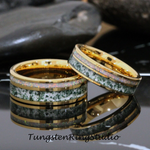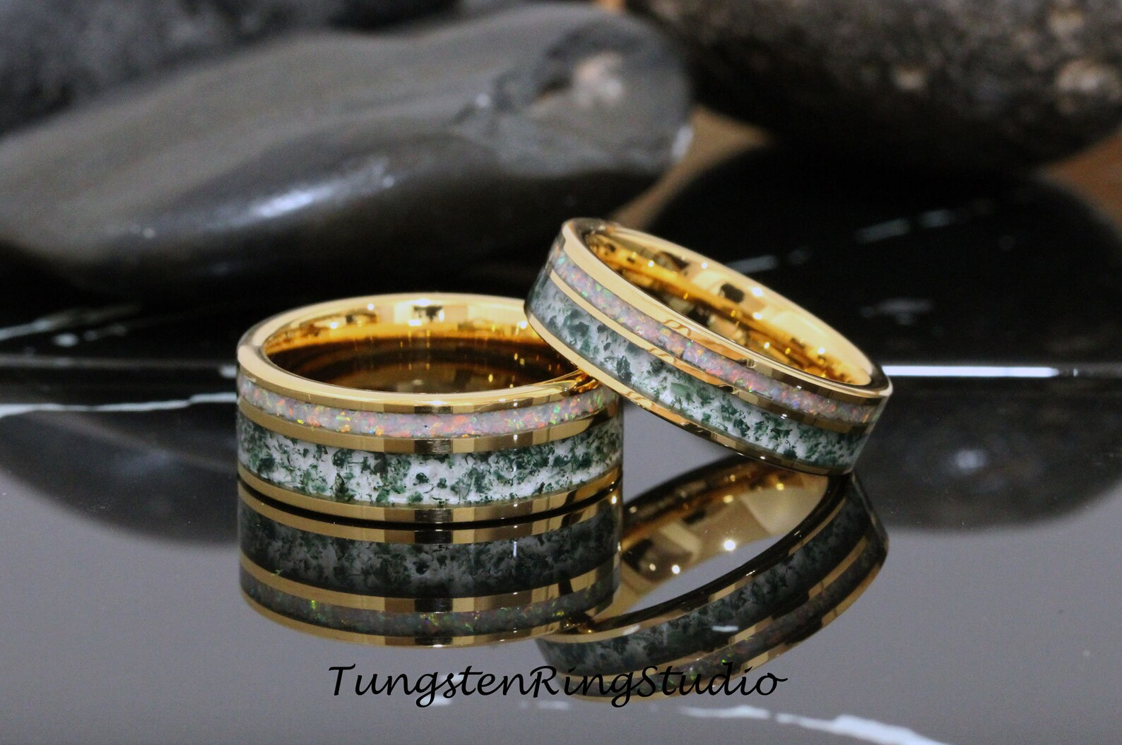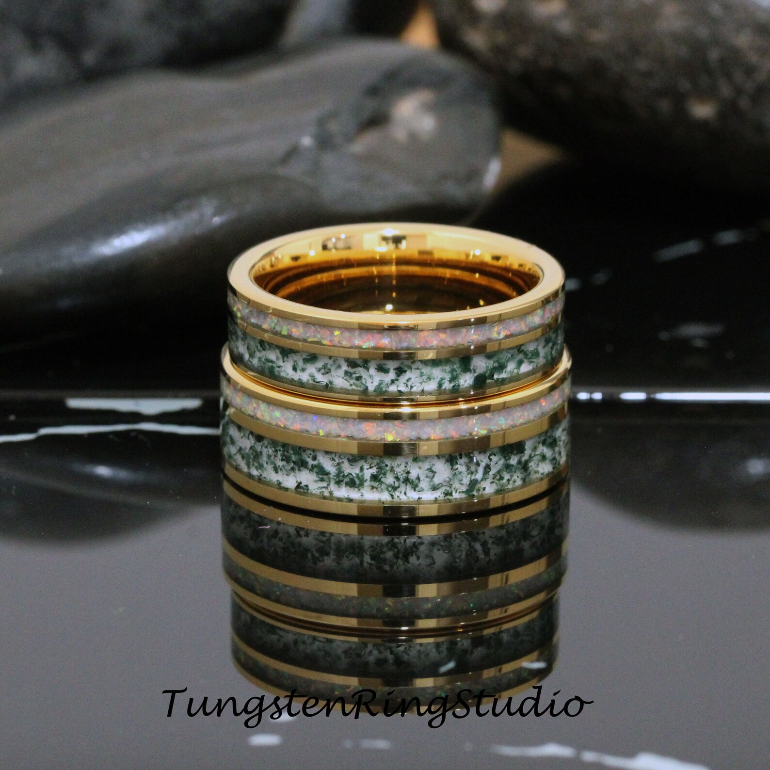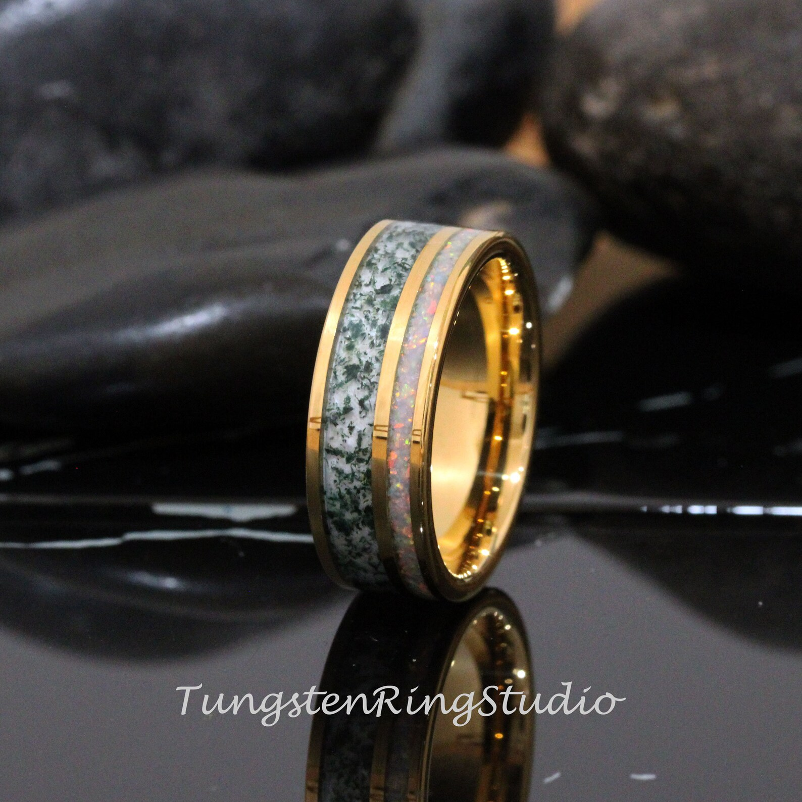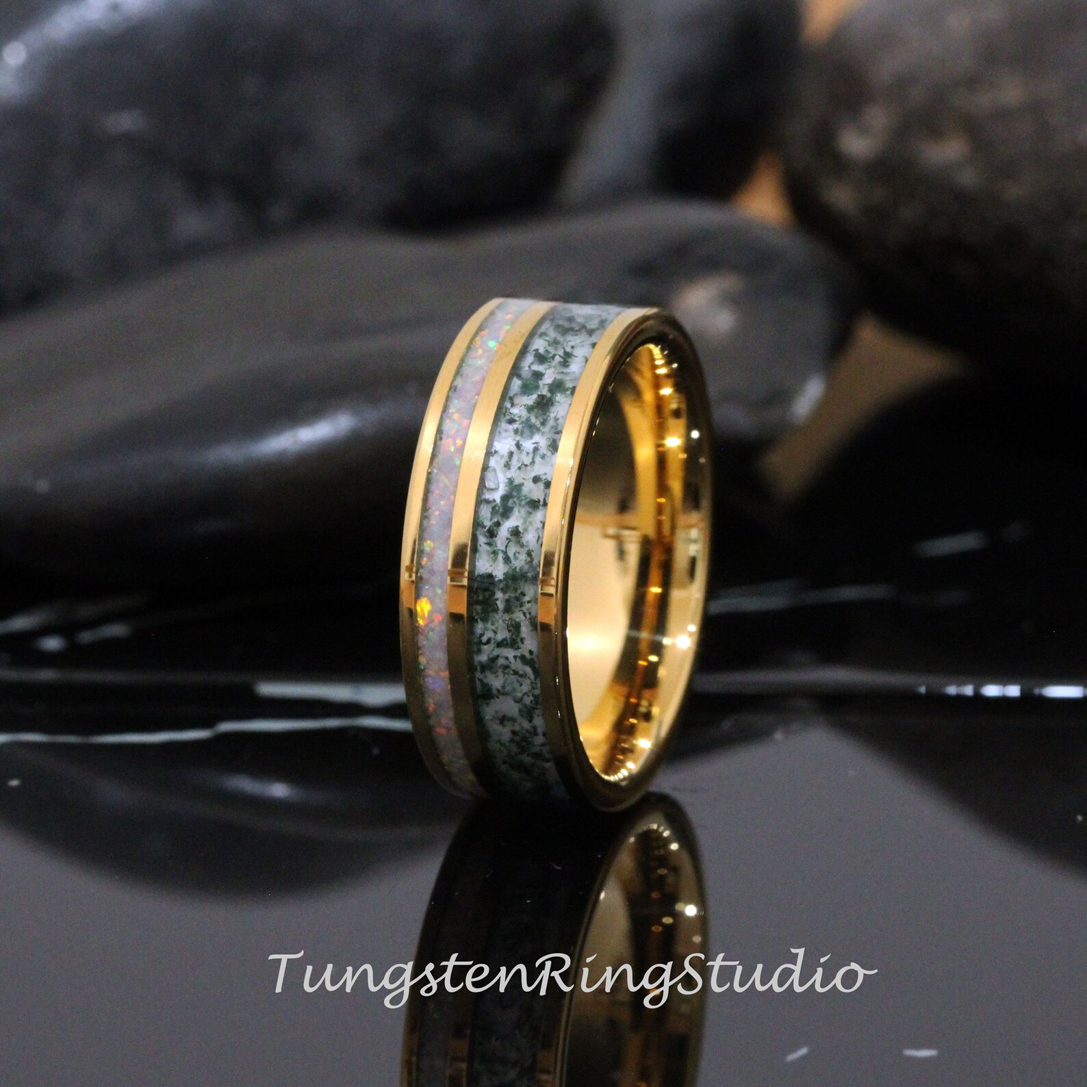 Moss Agate Fire White Opal Yellow Gold Tungsten Ring – TungstenRingStudio