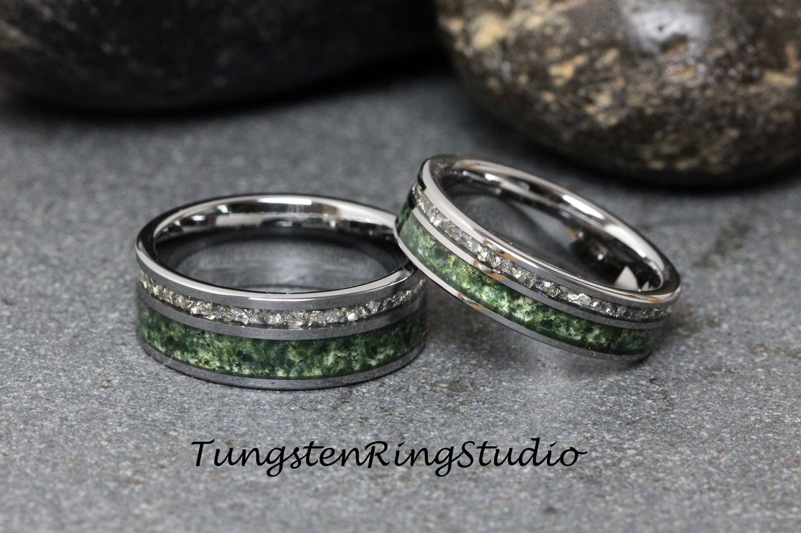 Moss Agate Silver German Glass Wedding Ring 8mm 6mm Diamond Alternative Rose Gold Tungsten Eco-Friendly Men Band Mens Ring Men & Women Ring