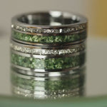 The moss agate inlay features a mesmerizing blend of translucent greens and earthy browns, reminiscent of a tranquil forest scene captured within the stone. Each ring showcases the natural variations and patterns of moss agate, making it a one-of-a-kind piece. It may have more or less moss depending on the pieces of moss agate. It is the nature of moss agate.