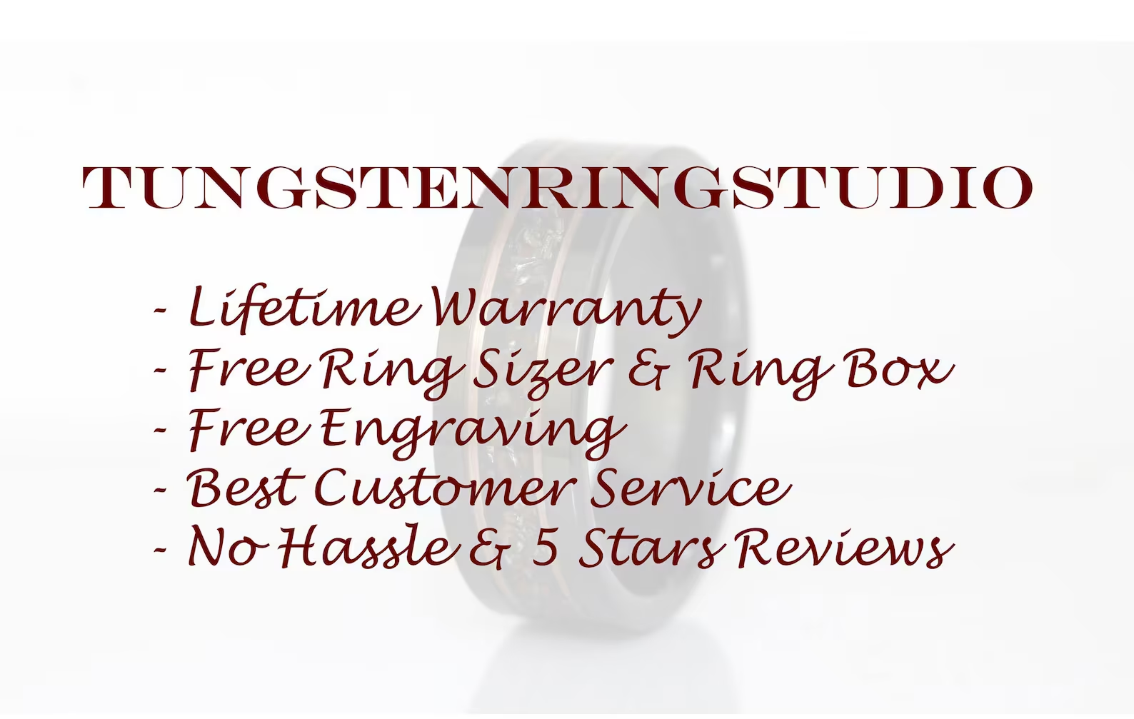 The warranty does not apply for normal wear and tear such as minor scratch. The warranty does not cover abuse wearing or sabotage action. Even though tungsten rings are the most durable and strong. Exposure to harsh chemicals (bleach,...), dropping the rings or collision to sharp objects may damage the inlaid materials and protective armor layer.