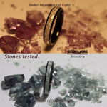 However, it is the closest Alexandrite's color which can be made into the wedding band. Diamond-cut Alexandrite solitary gem needs to be at least 3 - 4mm high in order to have the light reflecting inside. On the other hand, the wedding band's channel can be a maximum of 1.5mm in depth, so it is impossible to create an Alexandrite wedding band 100% matching Alexandrite engagement ring.