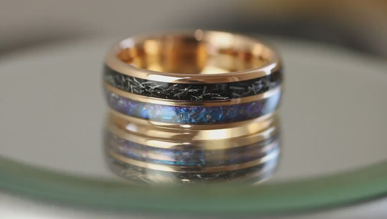 Combo Inlay: Gibeon Meteorite Shaving, and Crushed Lab-Grown Alexandrite Tungsten Wedding Ring