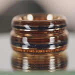 An amazing combination of crushed blue sandstones, Hawaiian Koa Wood, and rose gold band creates a desired wedding ring, an anniversary ring for couples. These crushed blue sandstone & Koa Wood inlaid rings are made of the best colored curly Koa wood, vibrant blue crushed opal, and high-quality Tungsten Carbide. The Koa wood layer was carefully peeled into a thin layer, then both wood and crushed stones inlaid over the groove of the tungsten setting, and finally covered with our protective armor layer that shields it from water, dirt, and grime in order to protect the wood and stone inside. The rings look great for every day or on your occasions.