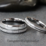 An amazing combination of Natural Mother of Pearl and Imitated Meteorite creates the desired wedding ring, an anniversary ring for couples. The mother of pearl and Meteorite inlaid over the groove of the tungsten setting, and finally covered with our protective armor layer that shields it from water, dirt, and grime in order to protect the inlay inside. The rings look great for every day or on your occasions.