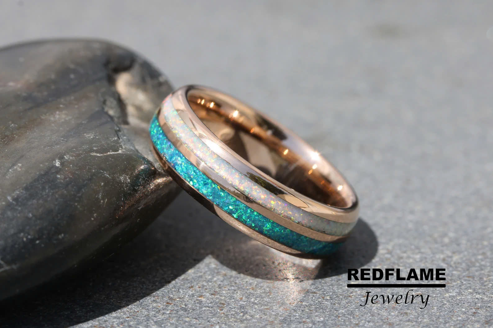 Fire Crushed White Opal Blue Opal Rose GoldTungsten Carbide Rings - Cu – TungstenRingStudio