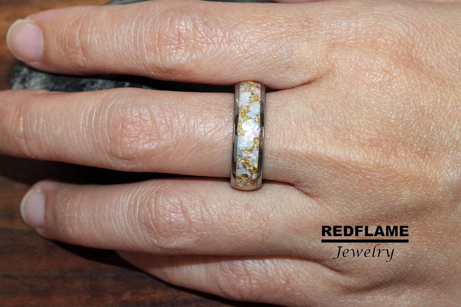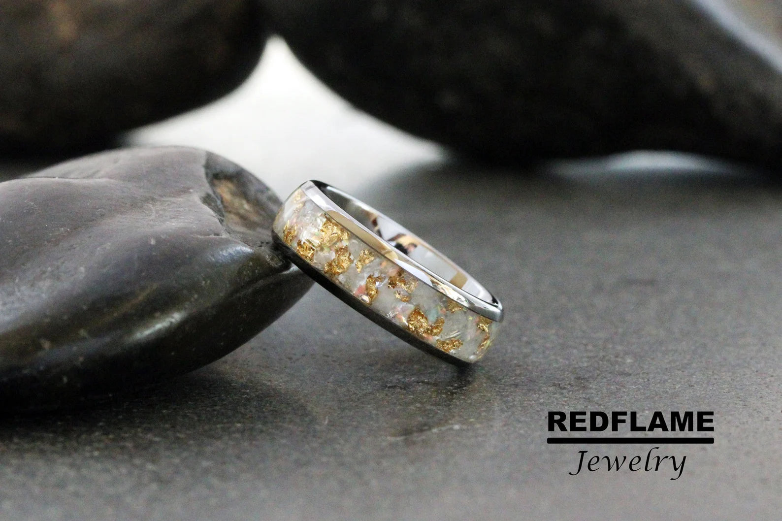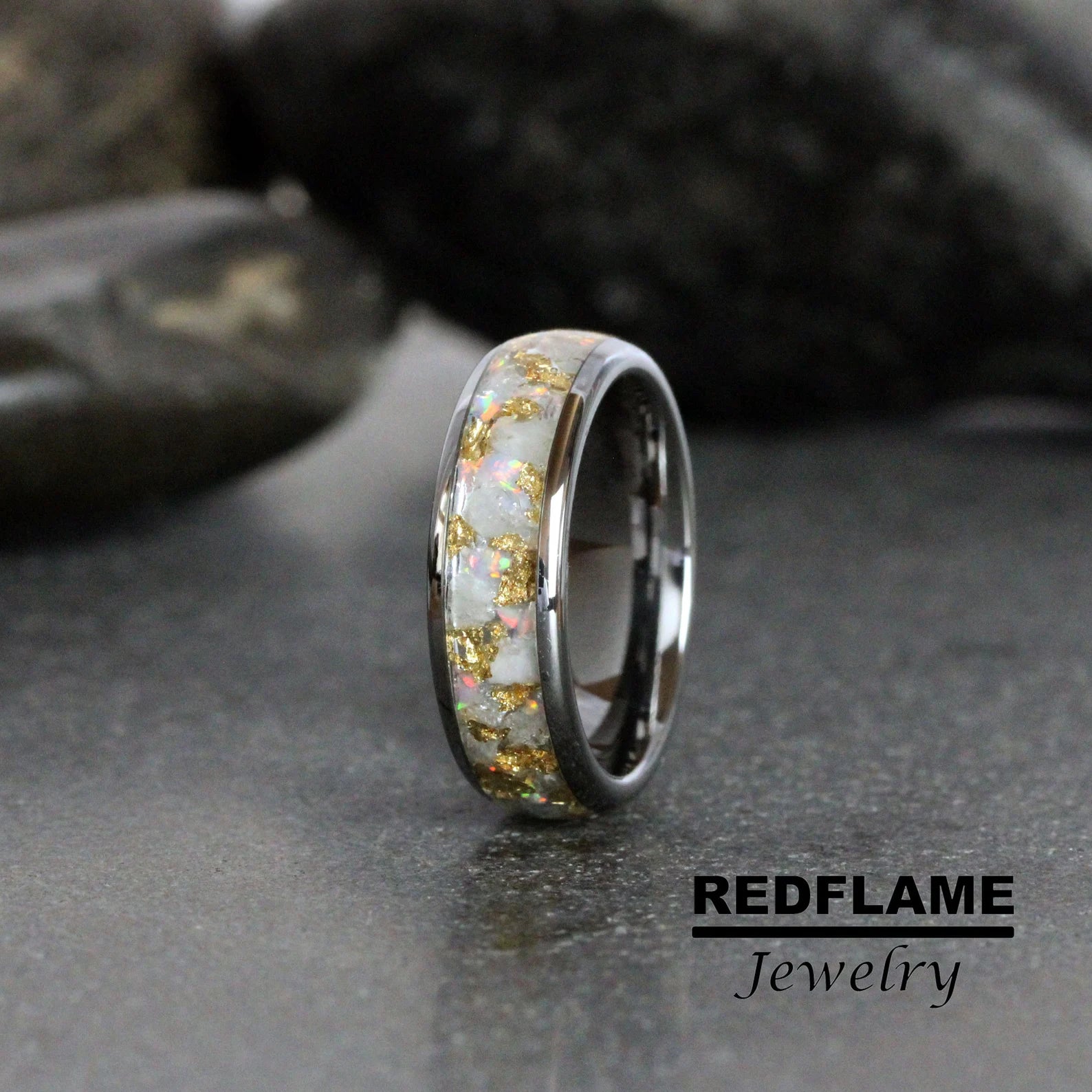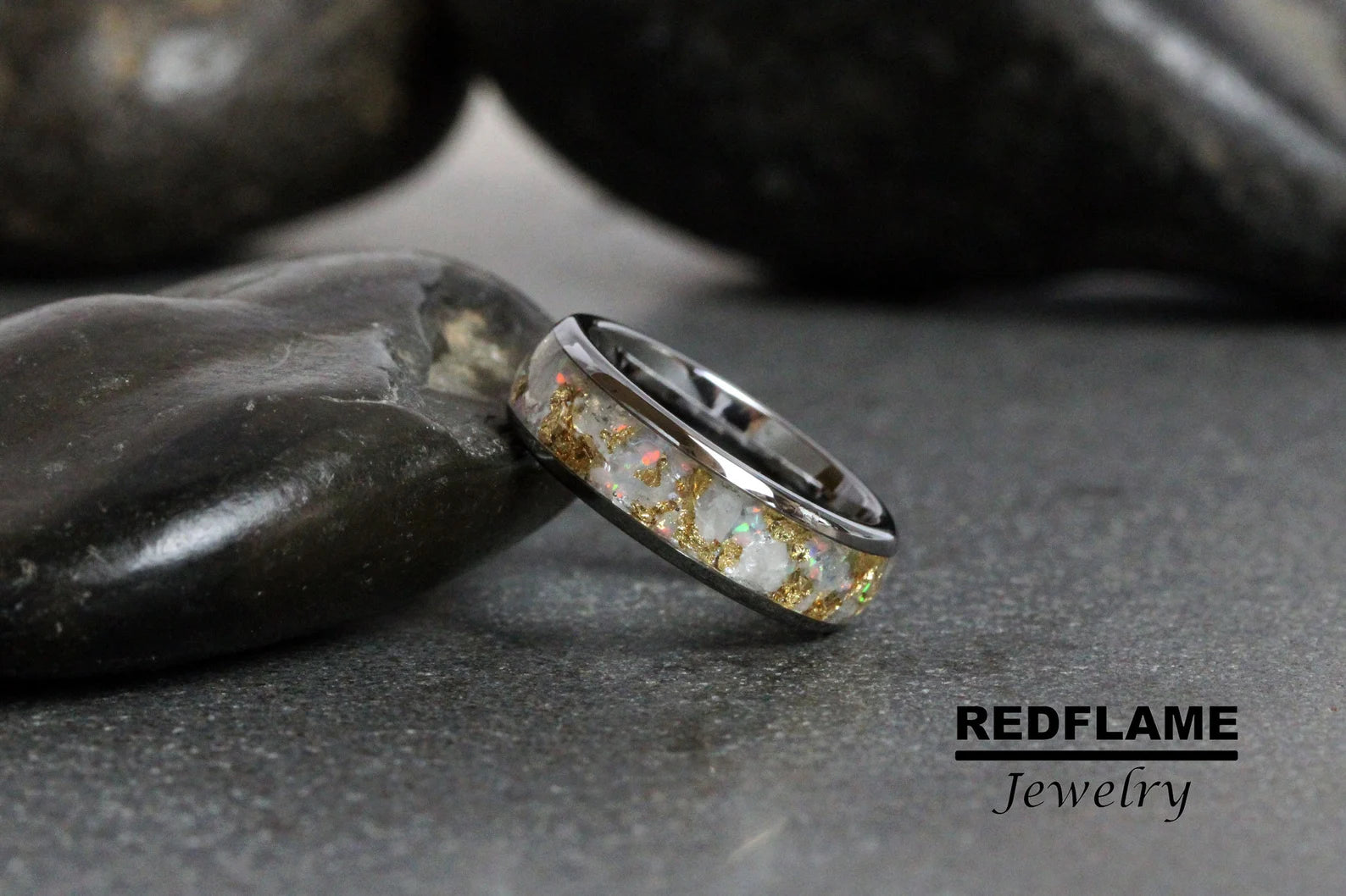 Combination of natural rainbow moonstone, 22K gold leaf foil and lab-created fire white opal inlaid over 6 mm tungsten ring.