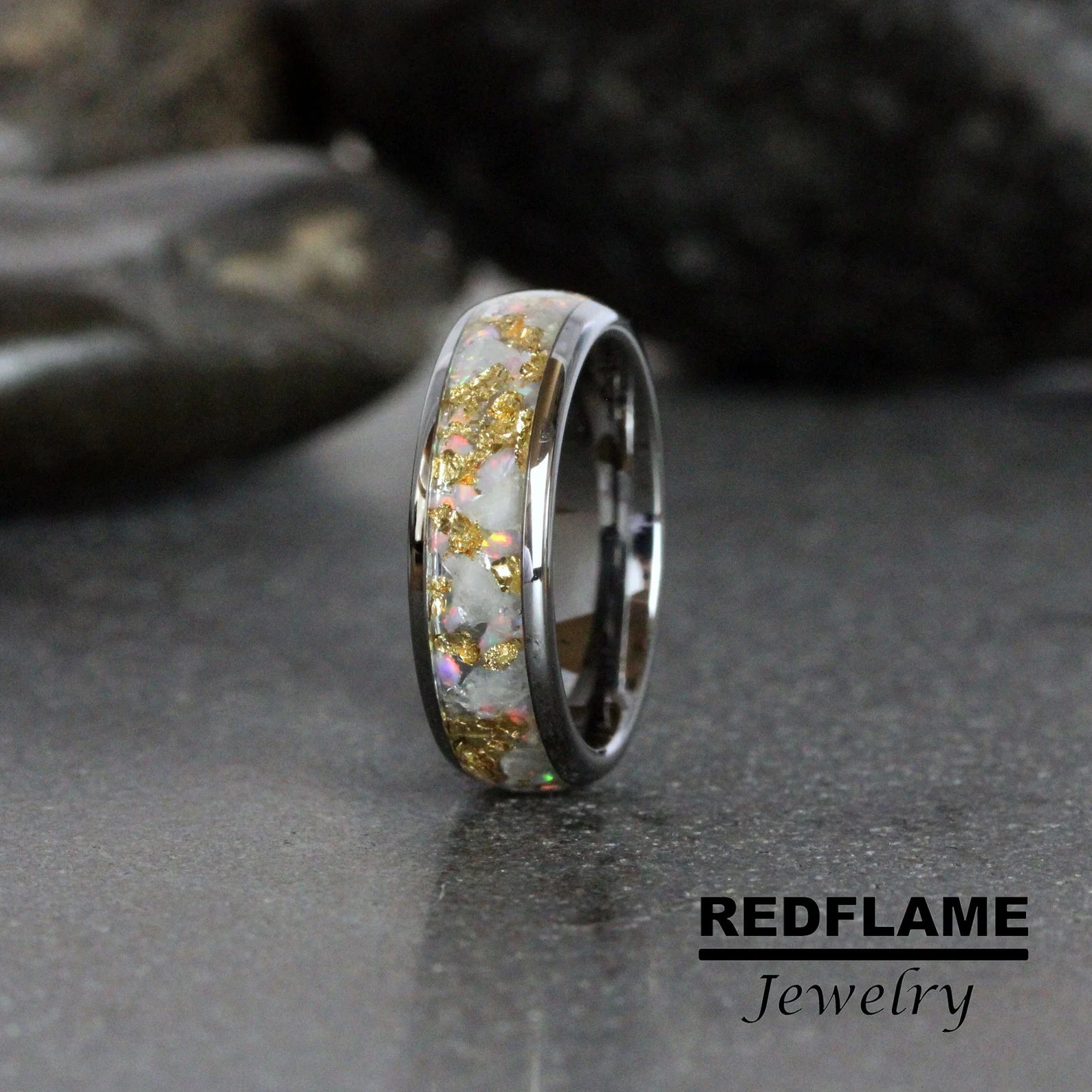 Gold Leaf Foil Wedding Band Rainbow Moonstone Ring White Opal Ring Rose Gold Black Yellow Silver Gray Tungsten Wedding Ring Women Mens Ring