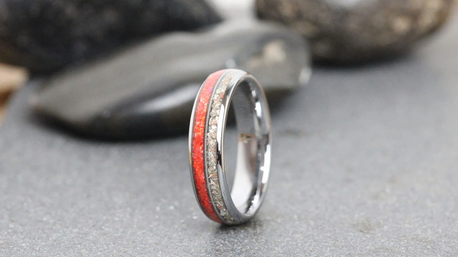 Combo Triple Inlay: German glass and Red Lab-grown Opal, guitar string Tungsten Carbide Wedding Ring