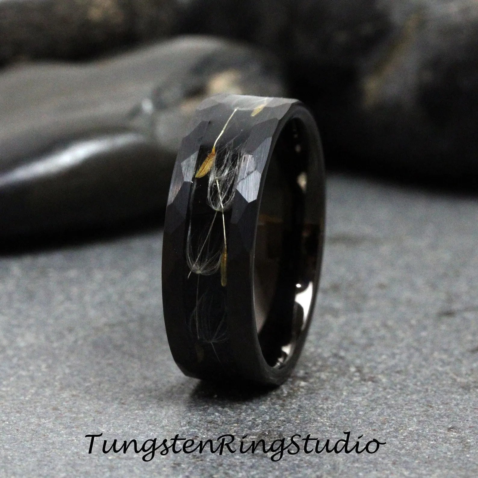 Hammer Dandelion Seed Silver Ring Polish Tungsten Wedding Ring 8mm Flower Dandelion Gray Ring Mens Ring Men & Women Anniversary