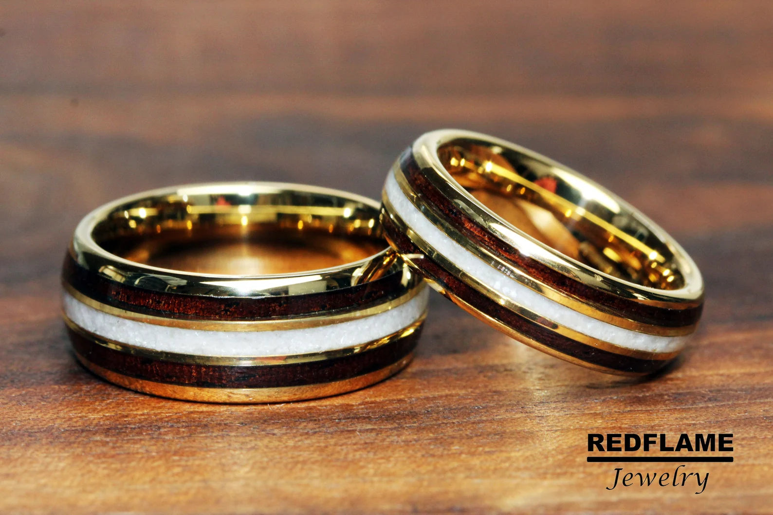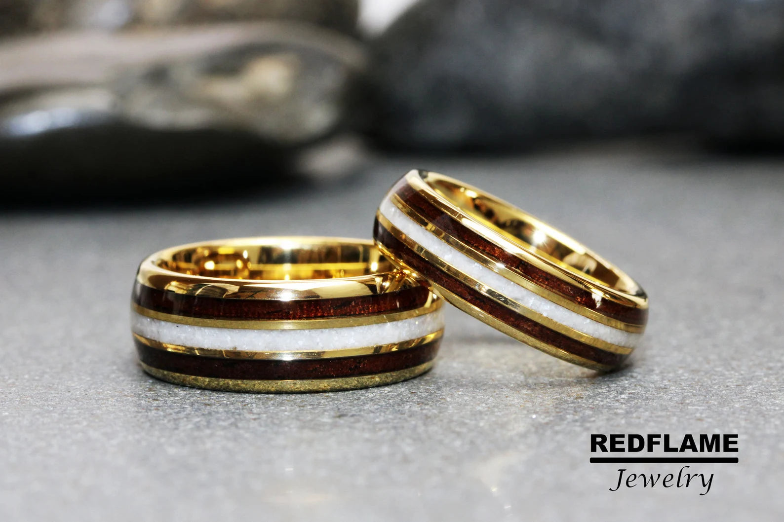Koa Wood Wedding Ring, Dark Curly Koa Wood Crushed Mother of Pearl Ring, Gold Ring, Tungsten Wedding Ring Mens Ring Anniversary 8mm 6mm Ring