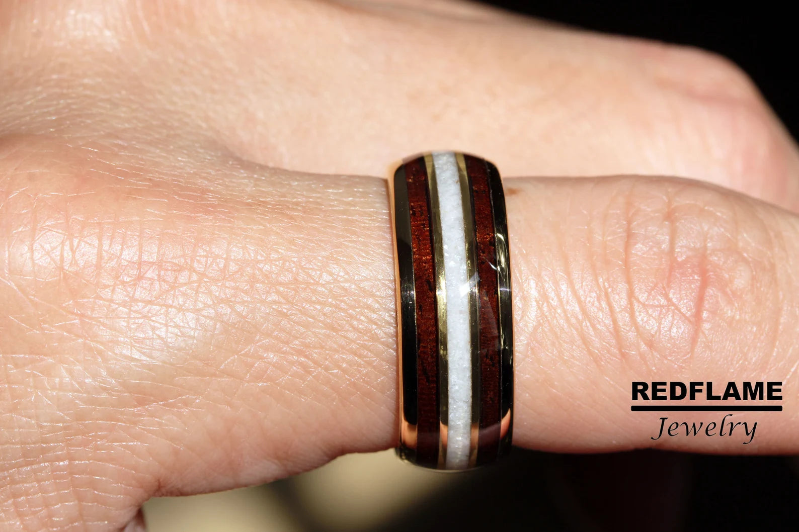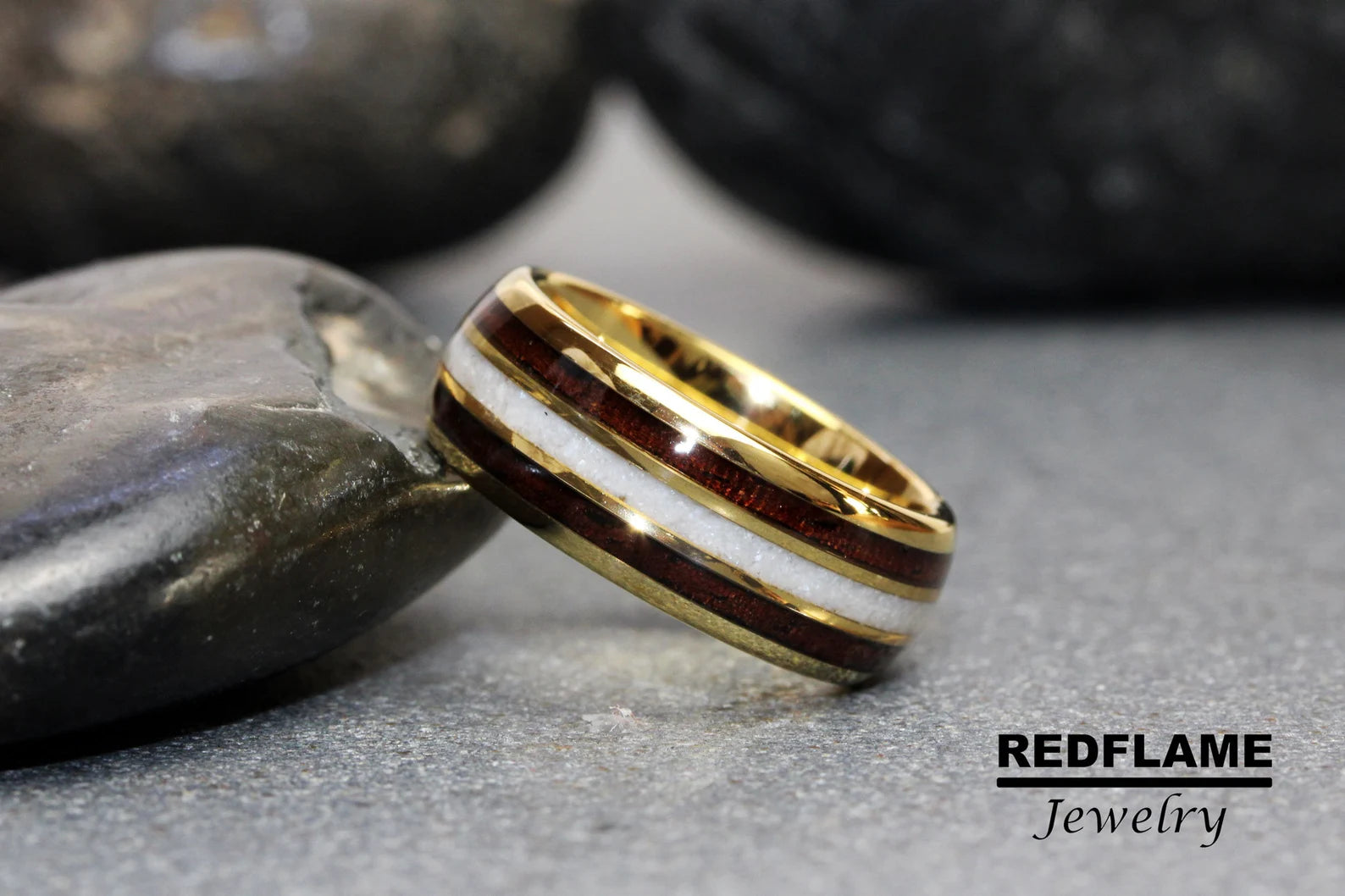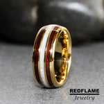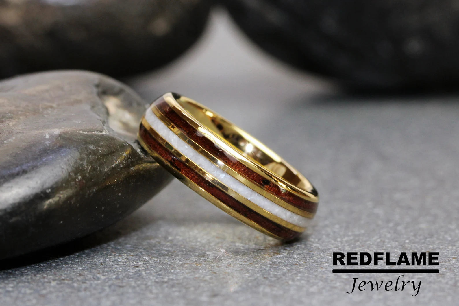Dark Curly Koa Wood and Crushed Natural Mother of Pearl inlaid over Gold Plating Tungsten Ring.