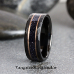 Black Hammer and Rose Gold Strips Tungsten Ring Inlaid Crushed Nebula Blue Sandstone