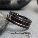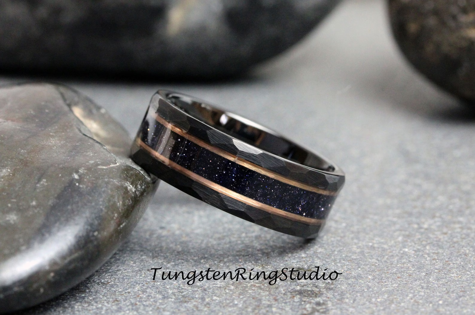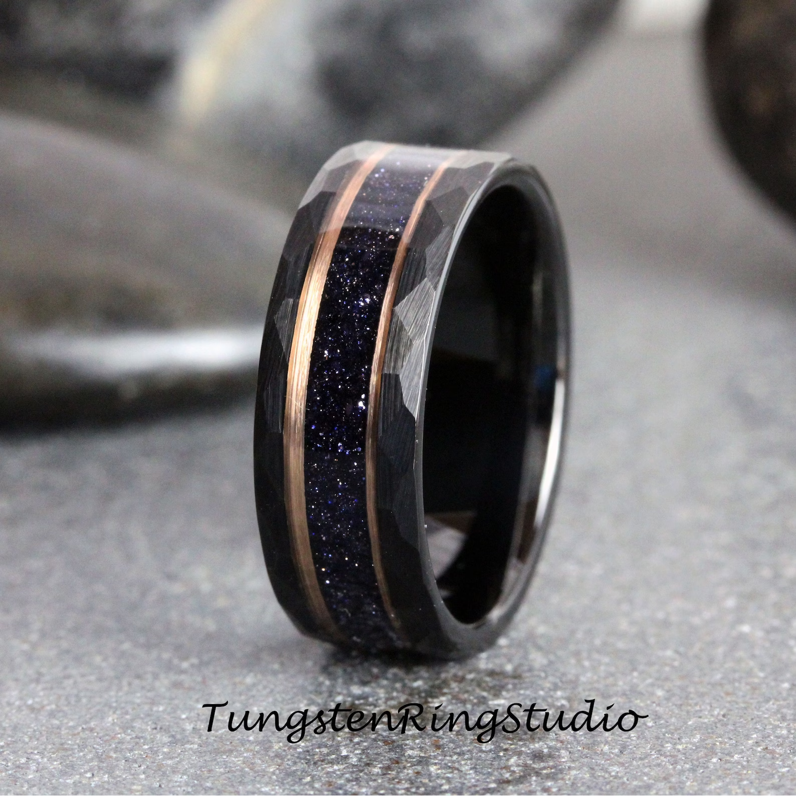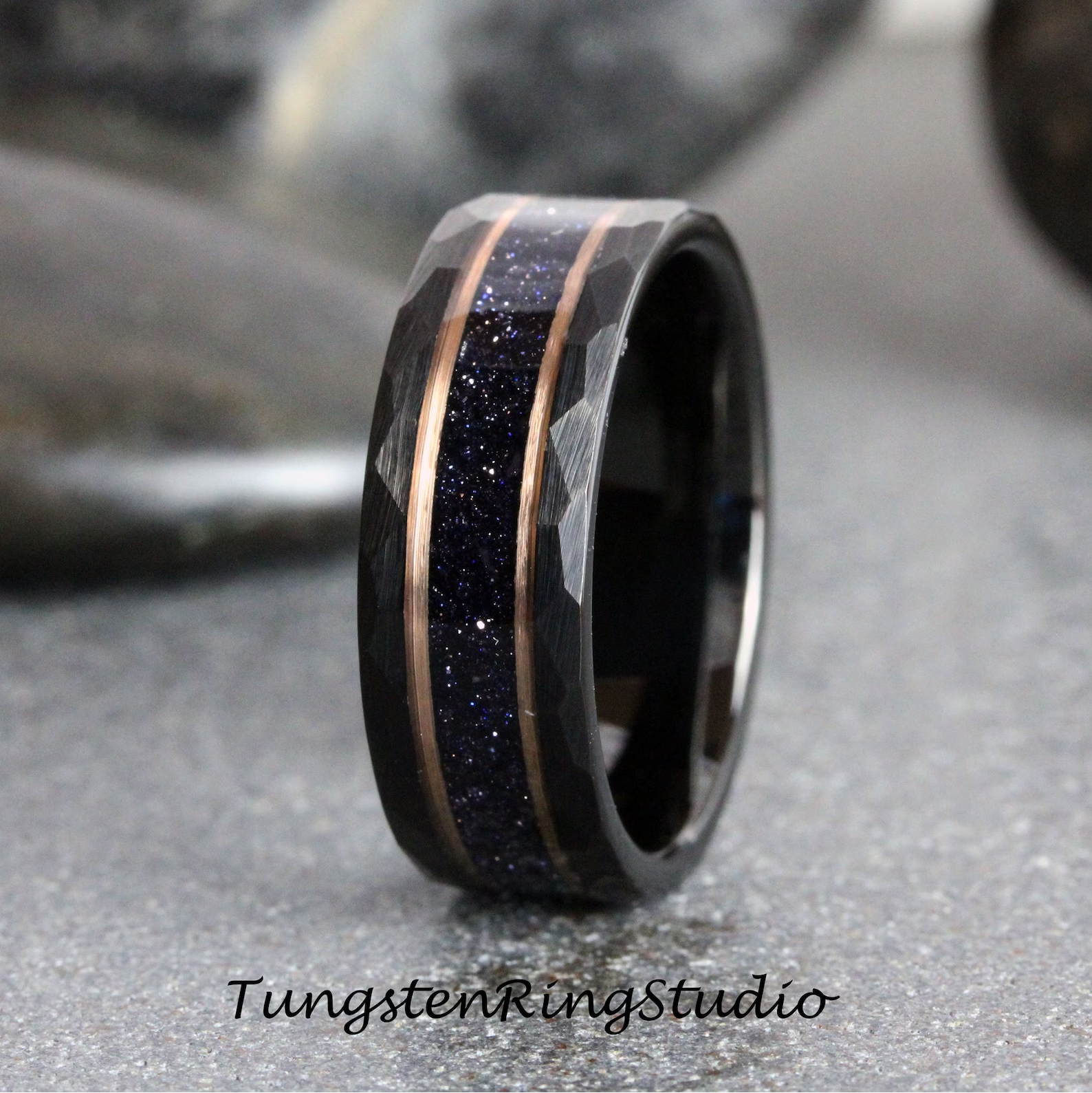 Mens Hammer Nebula Rose Gold Strip Ring Black Wedding Ring Blue Sandstone Ring Space Tungsten Carbide Anniversary Mans Mens Ring Men Accent