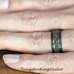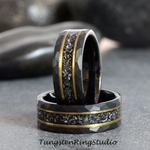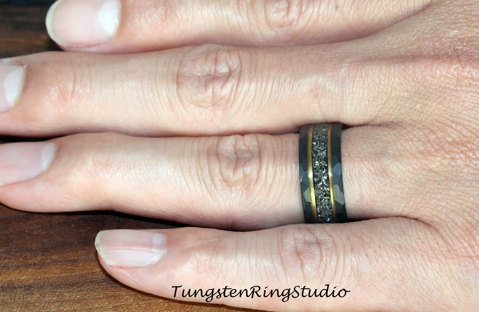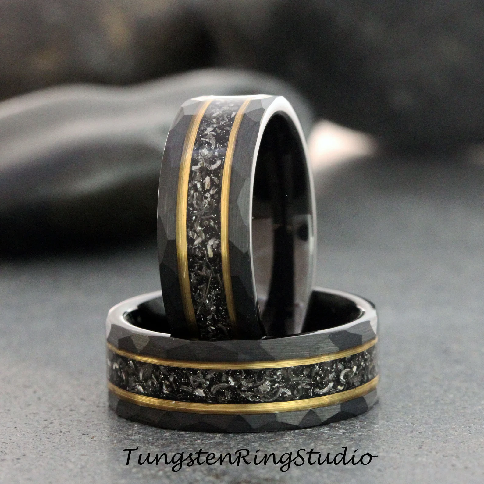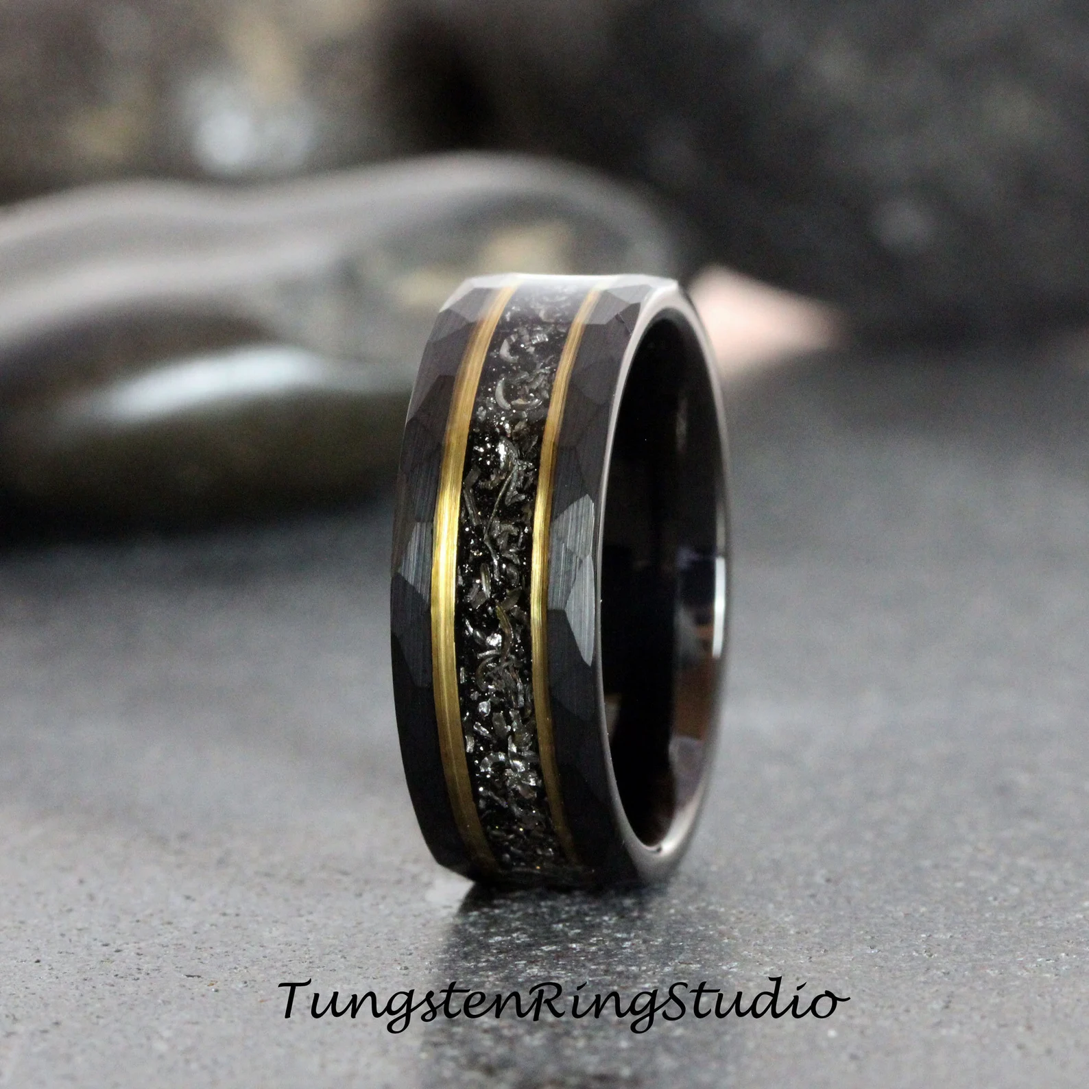 Meteorite Yellow Gold Strip Hammered Black Tungsten Carbide Ring – TungstenRingStudio