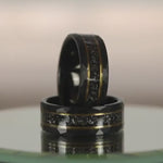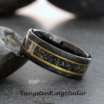 The unique Authentic Gibeon Meteorite Debris and Yellow Gold Strip plating with Black Tungsten create the desired wedding ring, an anniversary ring for couples. The Meteorite was inlaid over the groove of the tungsten setting and finally covered with our protective armor layer that shields it from water, dirt, and grime in order to protect the inlays inside. The rings look great for every day or on your occasions.