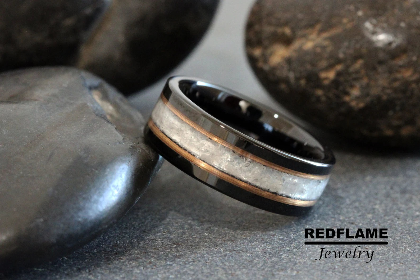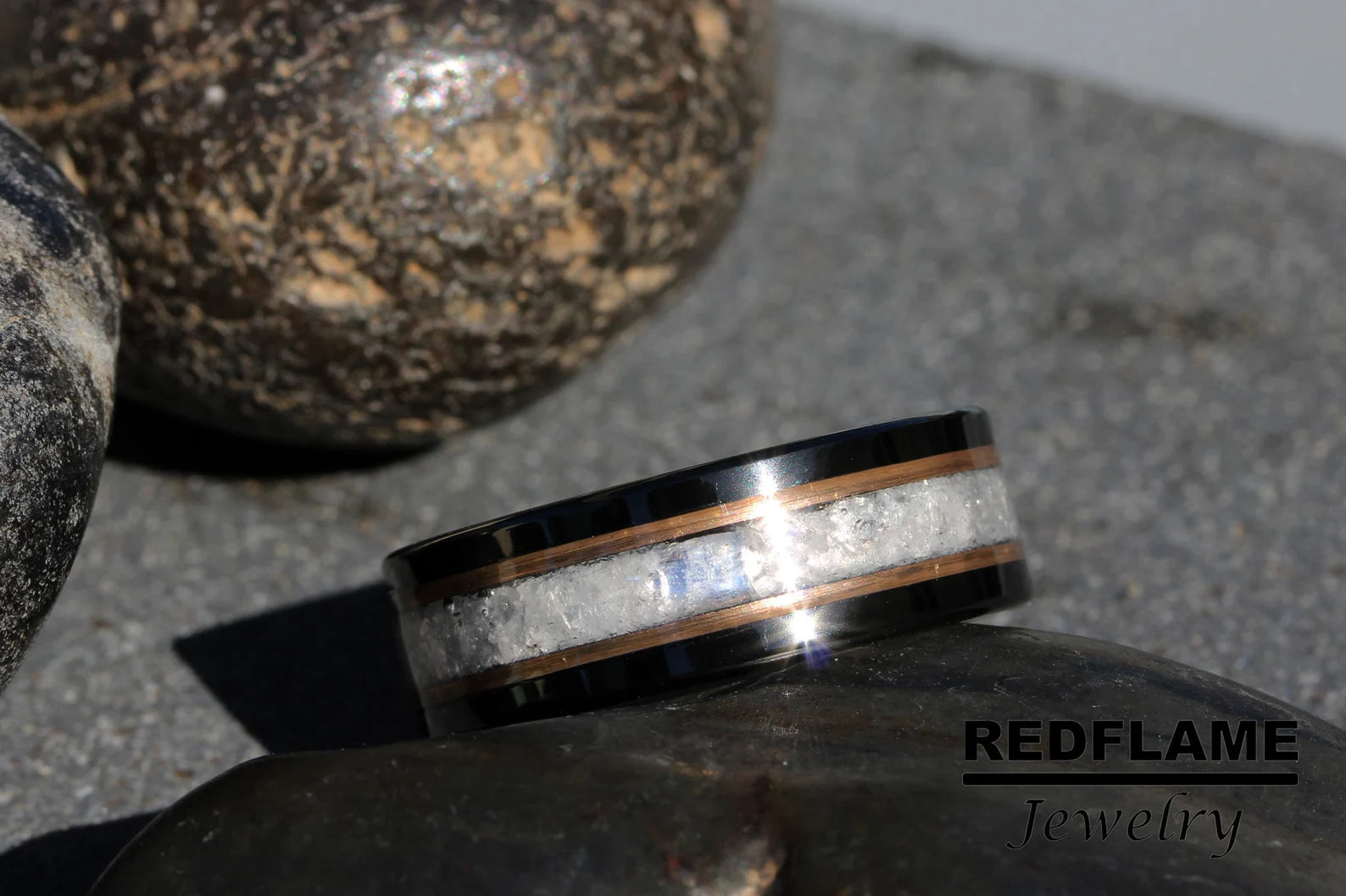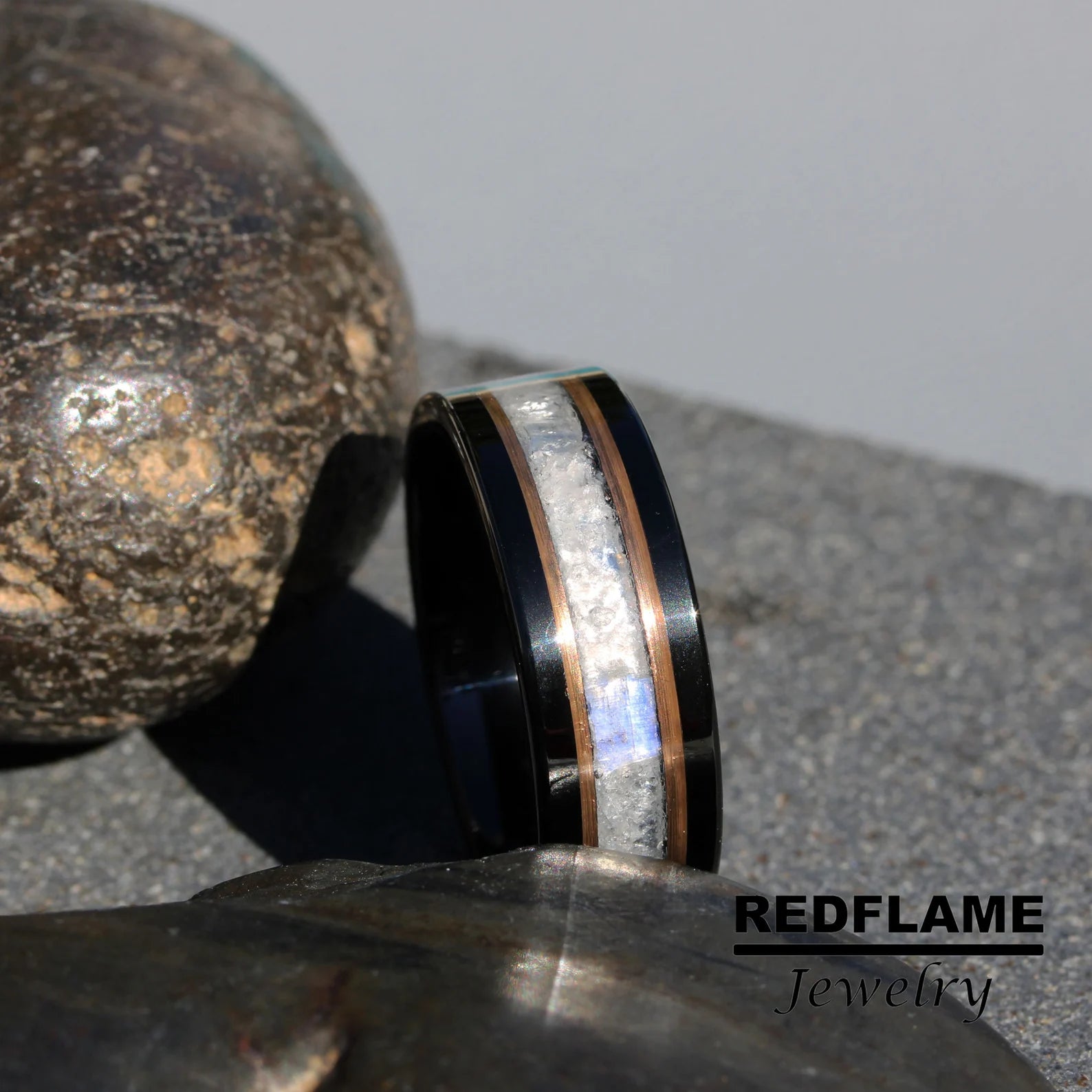 Mens Moonstone Ring Black Polish Rose Gold Accent Tungsten Wedding Ring 8 6 mm Man Rainbow Moonstone Natural Crushed Stone Band Custom Order