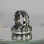 An amazing combination of Genuine Natural-Shed Deer Elk Antler, Silver Arrow and Imitated Meteorite creates the desired wedding ring, anniversary ring for couples. These rings are made of the best Deer Elk Antler, radiant silver meteorite, and high-quality Tungsten Carbide. The Antler layer was carefully peeled into a thin layer, then both Antler and Meteorite inlaid over the groove of the tungsten setting, and finally covered with our protective armor layer that shields it from water, dirt, and grime in order to protect the inlays inside. The rings look great for every day or on your occasions.