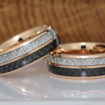 Amazing combination of Black Carbon Fiber and Imitated Meteorite creates a desired wedding ring, anniversary ring for couples. The meteorite and carbon fiber are inlaid over the groove of the tungsten setting, and finally covered with our protective armor layer that shields it from water, dirt, and grime in order to protect the inlays inside. The rings look great for every day or on your occasions.
