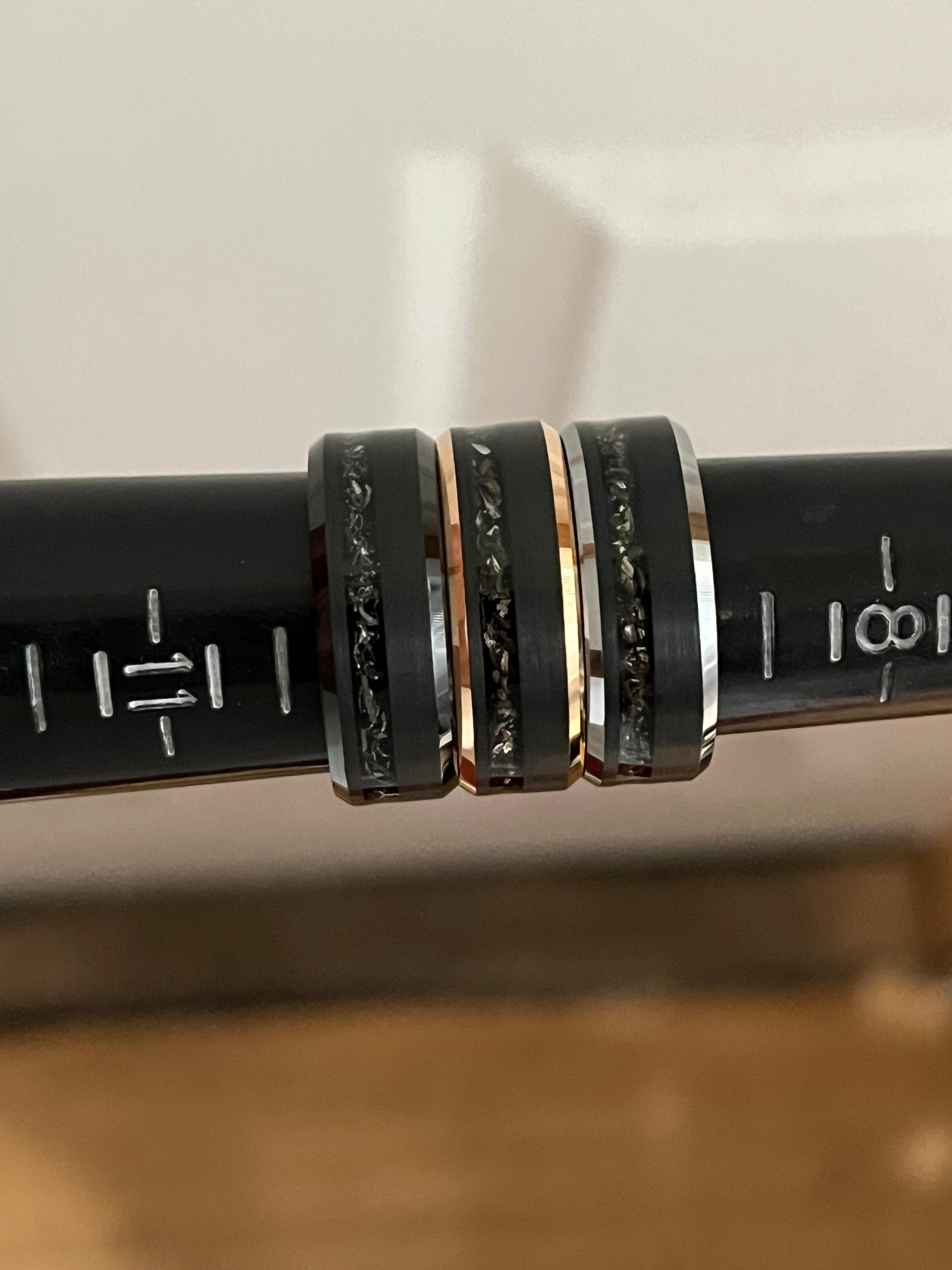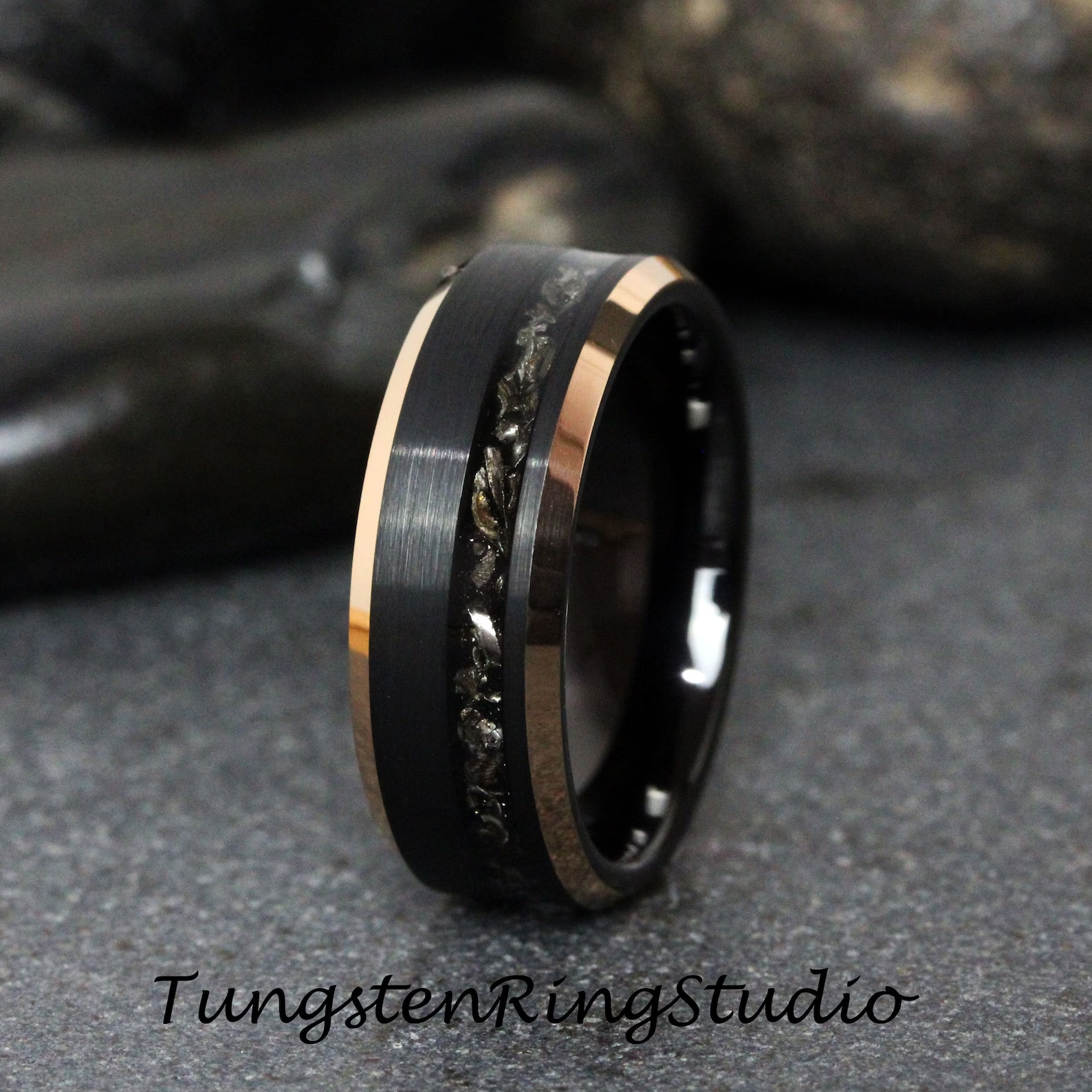 Meteorite Black Bevel Rose Gold Edges Tungsten Carbide Ring – TungstenRingStudio