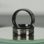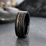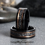 The unique Authentic Gibeon Meteorite Debris and Rose Gold Strip with Black Tungsten create the desired wedding ring, an anniversary ring for couples. The Meteorite was inlaid over the groove of the tungsten setting and finally covered with our protective armor layer that shields it from water, dirt, and grime in order to protect the inlays inside. The rings look great for every day or on your occasions.