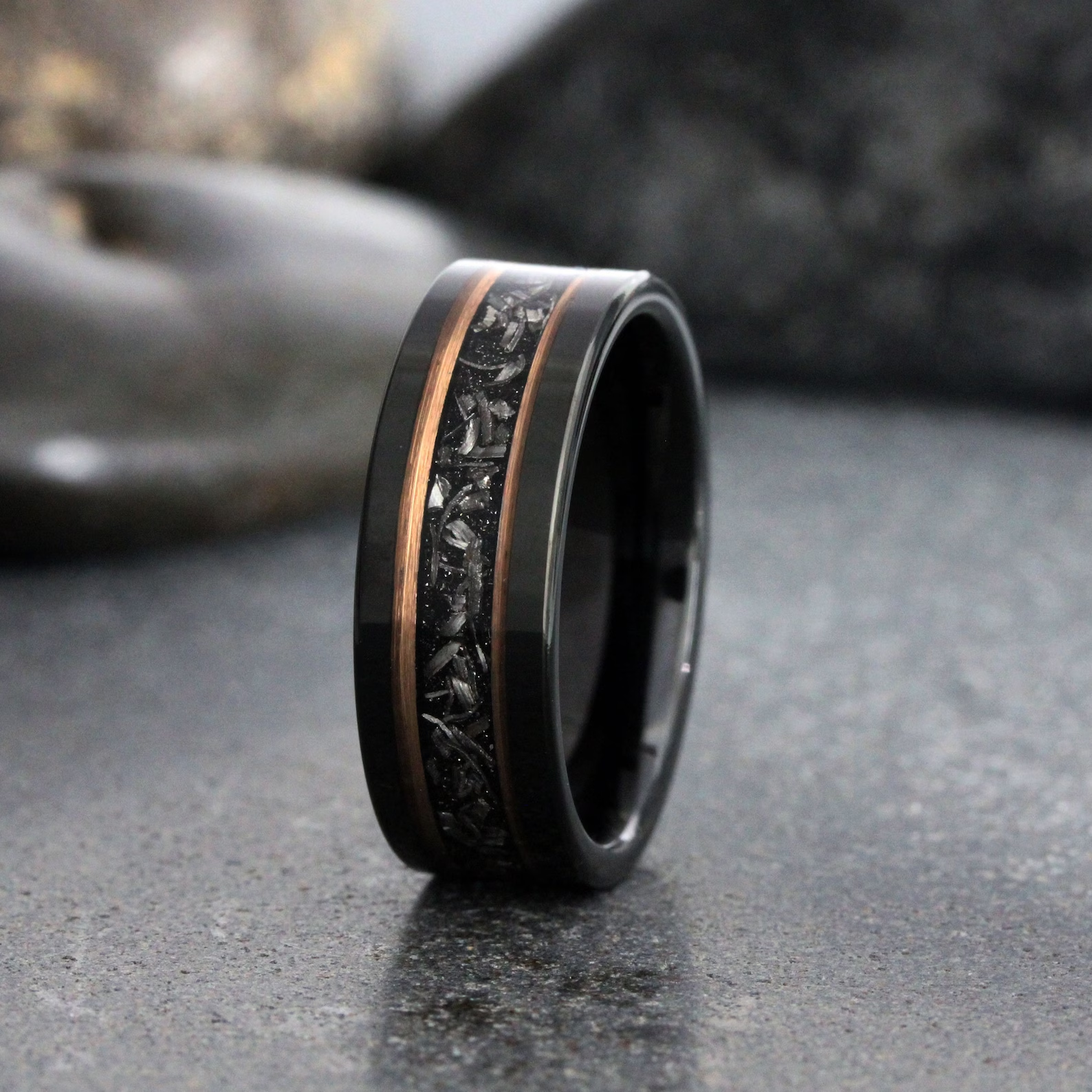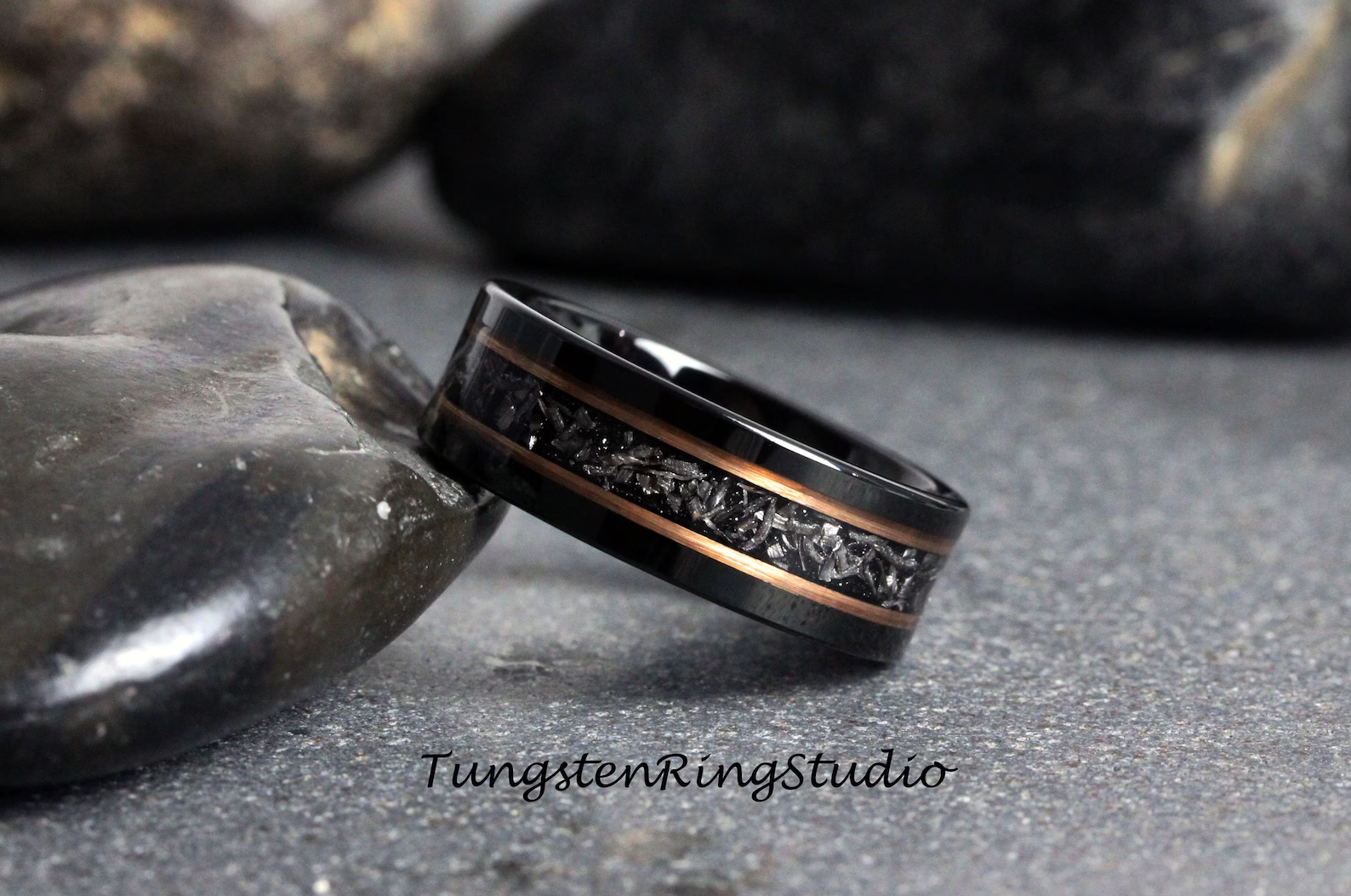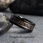 Meteorite Rose Gold Strip Black Tungsten Carbide Ring – TungstenRingStudio