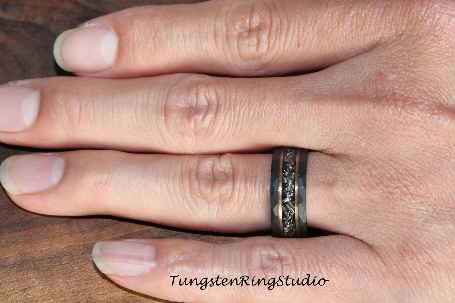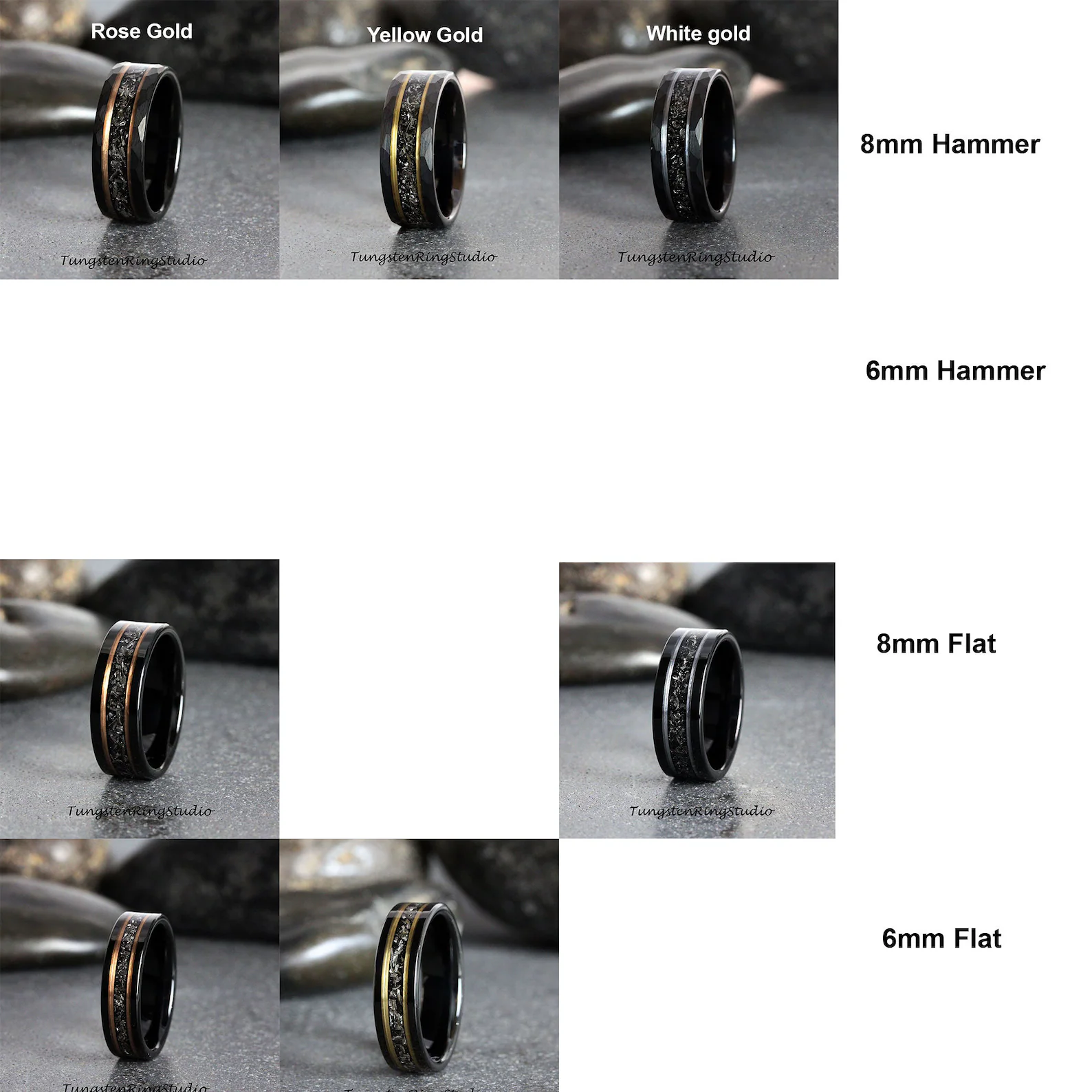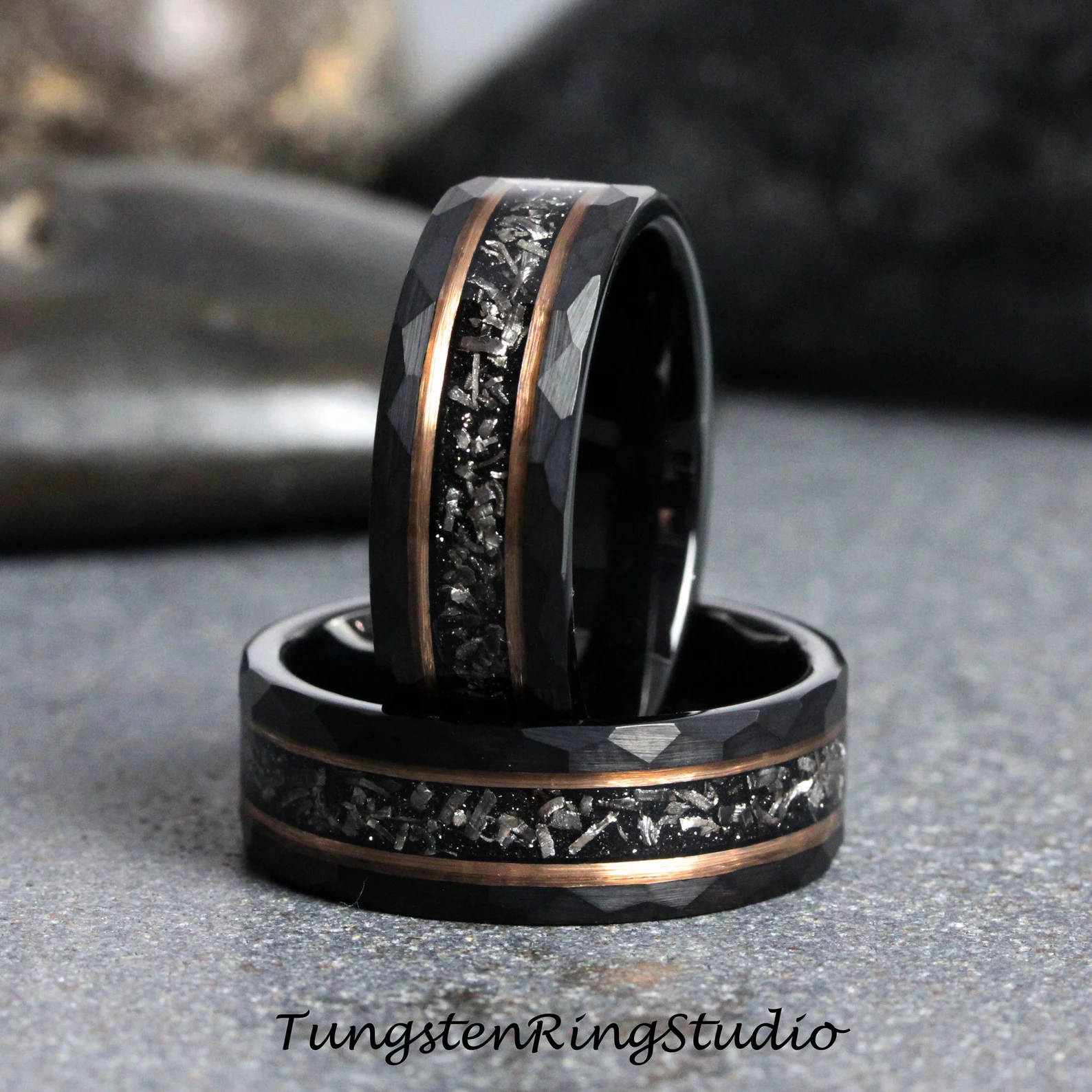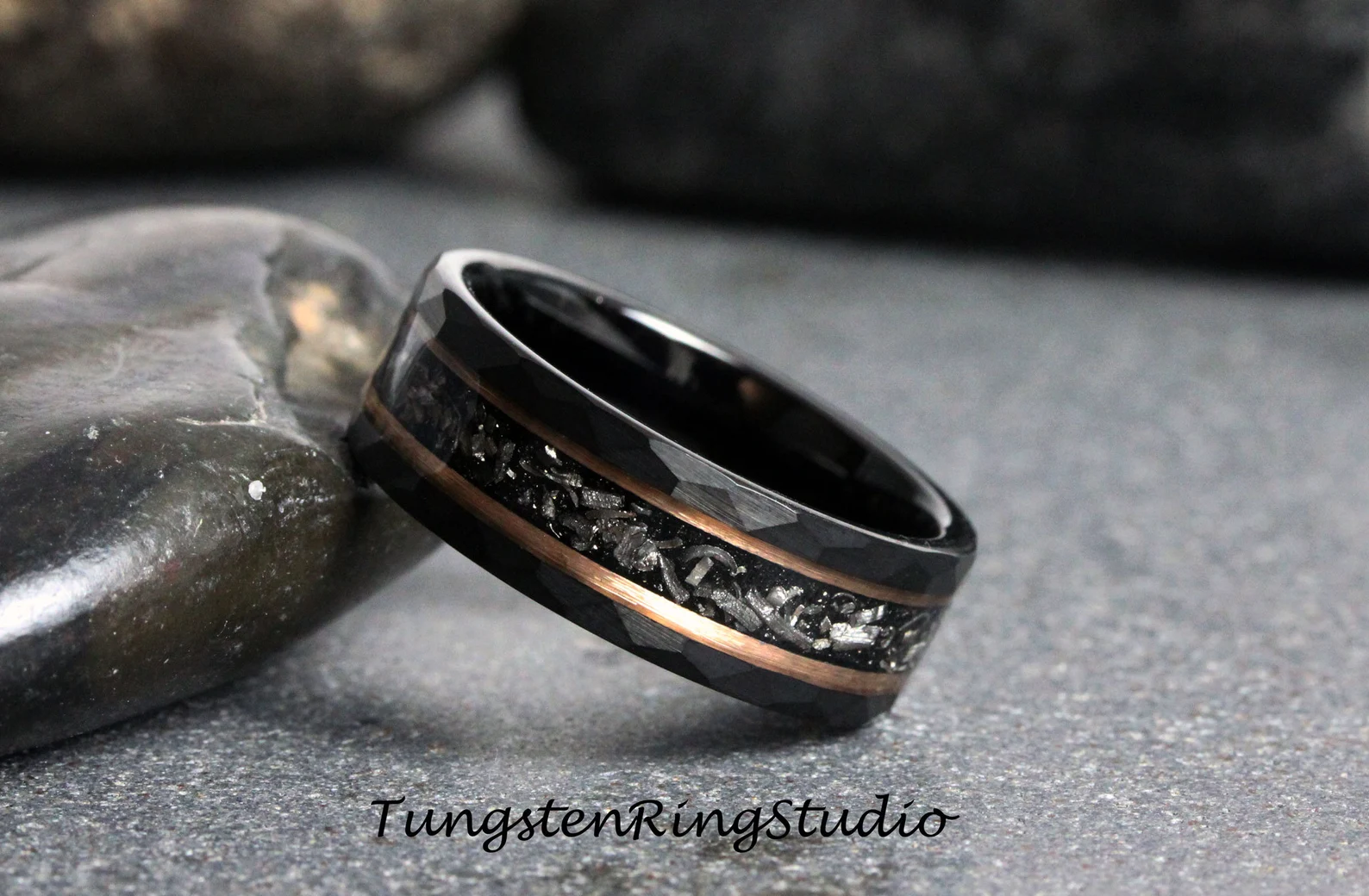 Meteorite Rose Gold Strip Hammered Black Tungsten Carbide Ring – TungstenRingStudio