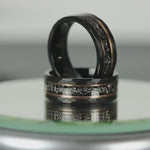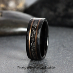 The unique Authentic Gibeon Meteorite Debris and Rose Gold Strip with Black Tungsten create the desired wedding ring, an anniversary ring for couples. The Meteorite was inlaid over the groove of the tungsten setting and finally covered with our protective armor layer that shields it from water, dirt, and grime in order to protect the inlays inside. The rings look great for every day or on your occasions.