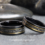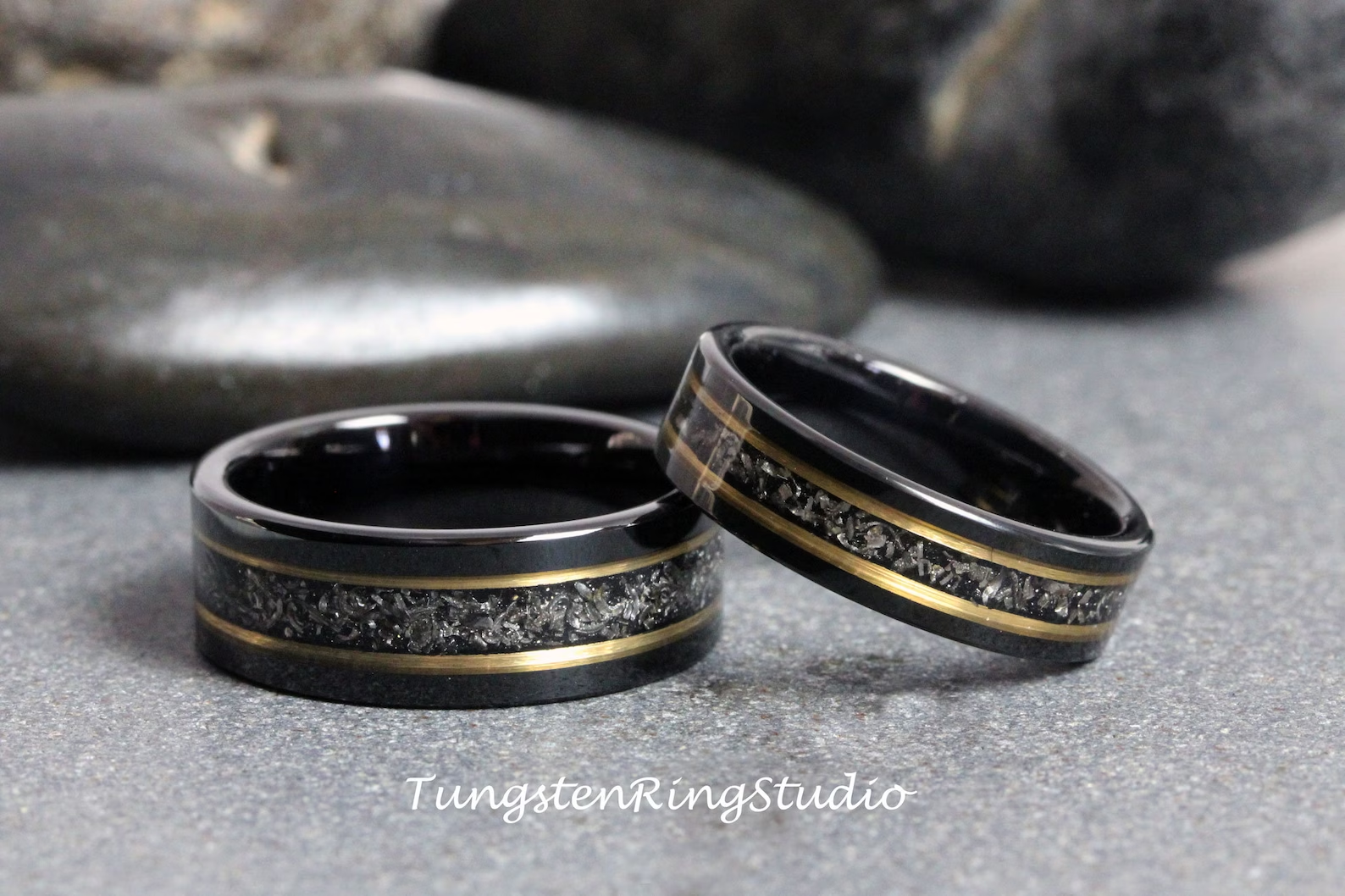 he unique Authentic Gibeon Meteorite Debris and Yellow Gold Strip with Black Tungsten create the desired wedding ring, an anniversary ring for couples. The Meteorite was inlaid over the groove of the tungsten setting and finally covered with our protective armor layer that shields it from water, dirt, and grime in order to protect the inlays inside. The rings look great for every day or on your occasions.