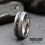 Combo Triple Inlay: Gibeon Meteorite Shaving, Guitar String, and Crushed Moonstone Tungsten Wedding Ring