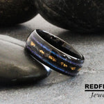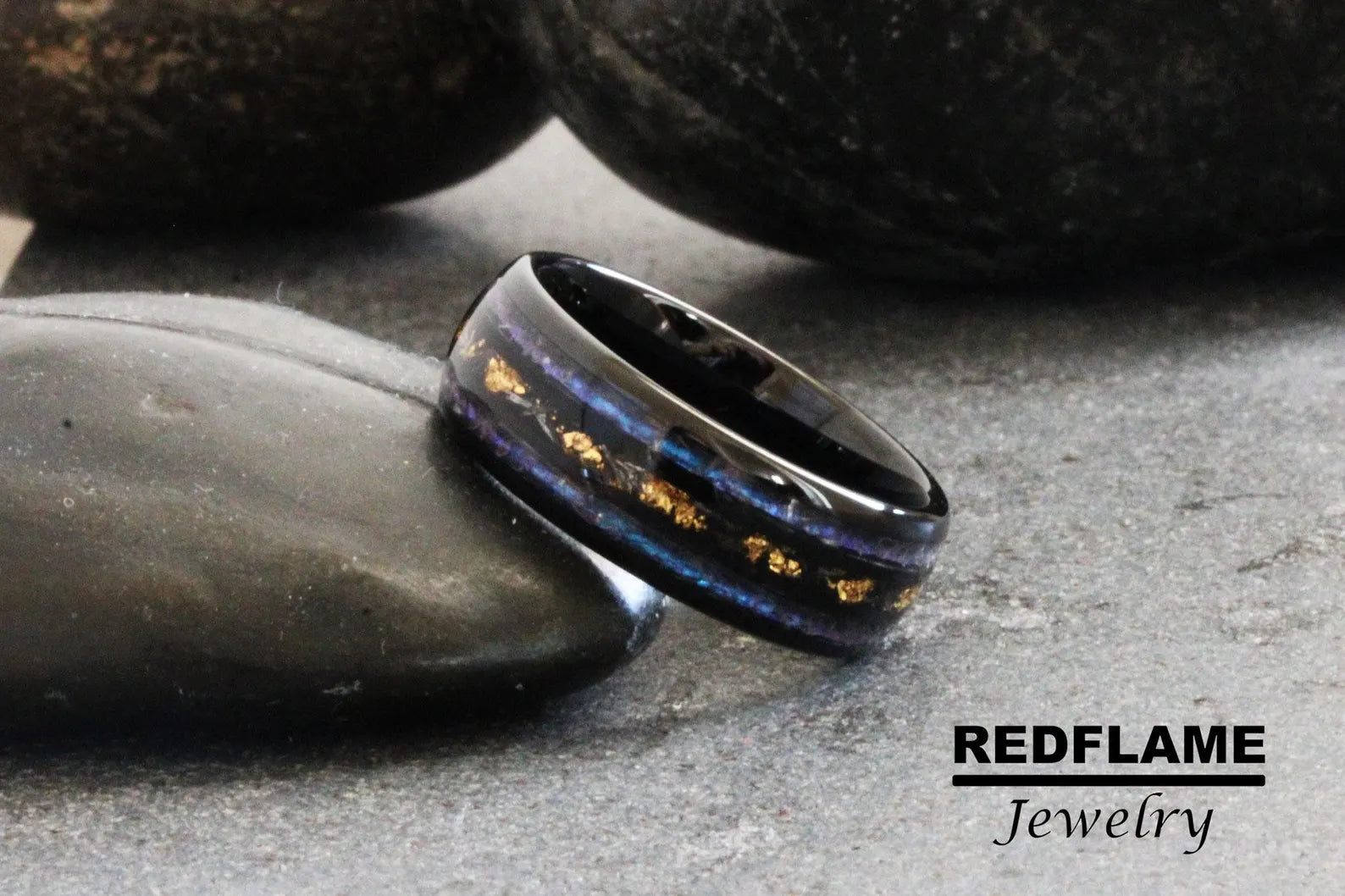 Combo Triple Inlay: Gold Leaf, Gibeon Meteorite Shaving, and Crushed Lab-Grown Alexandrite Tungsten Wedding Ring