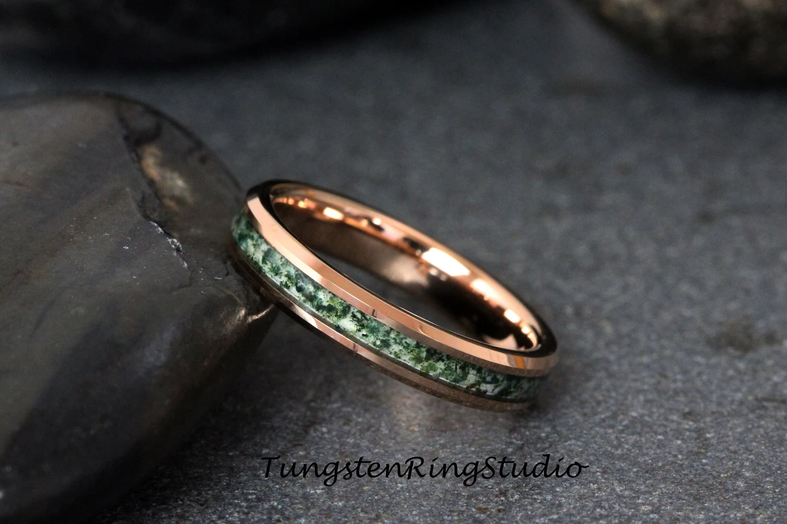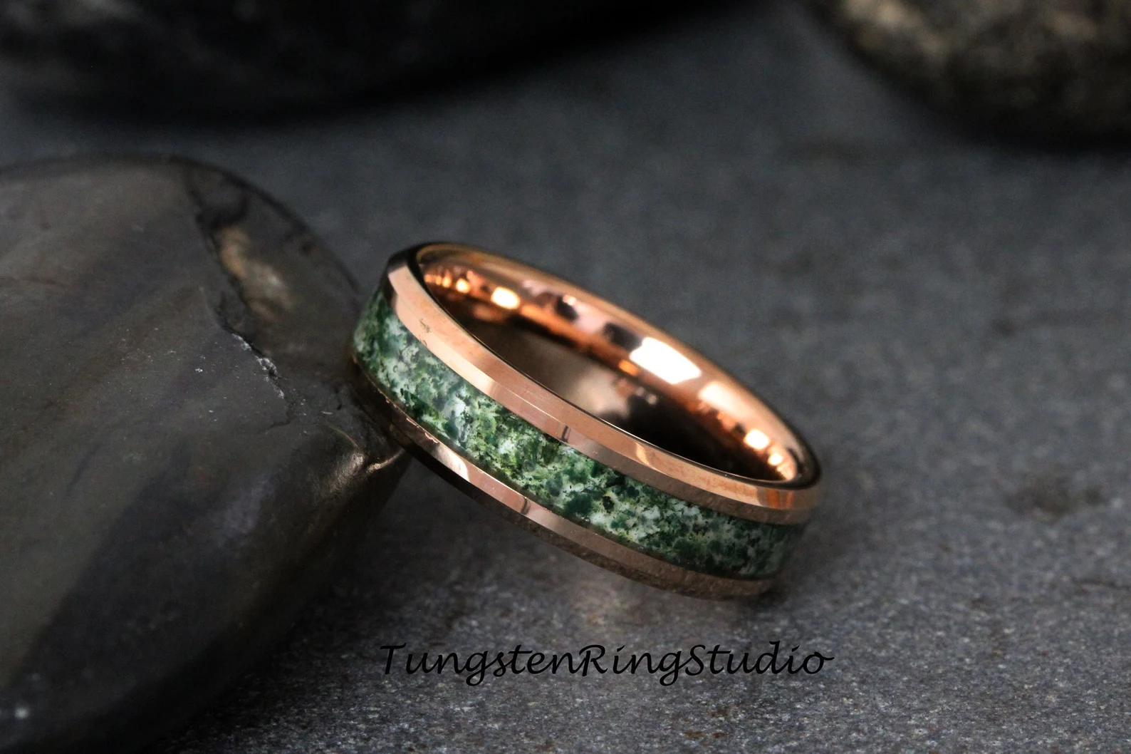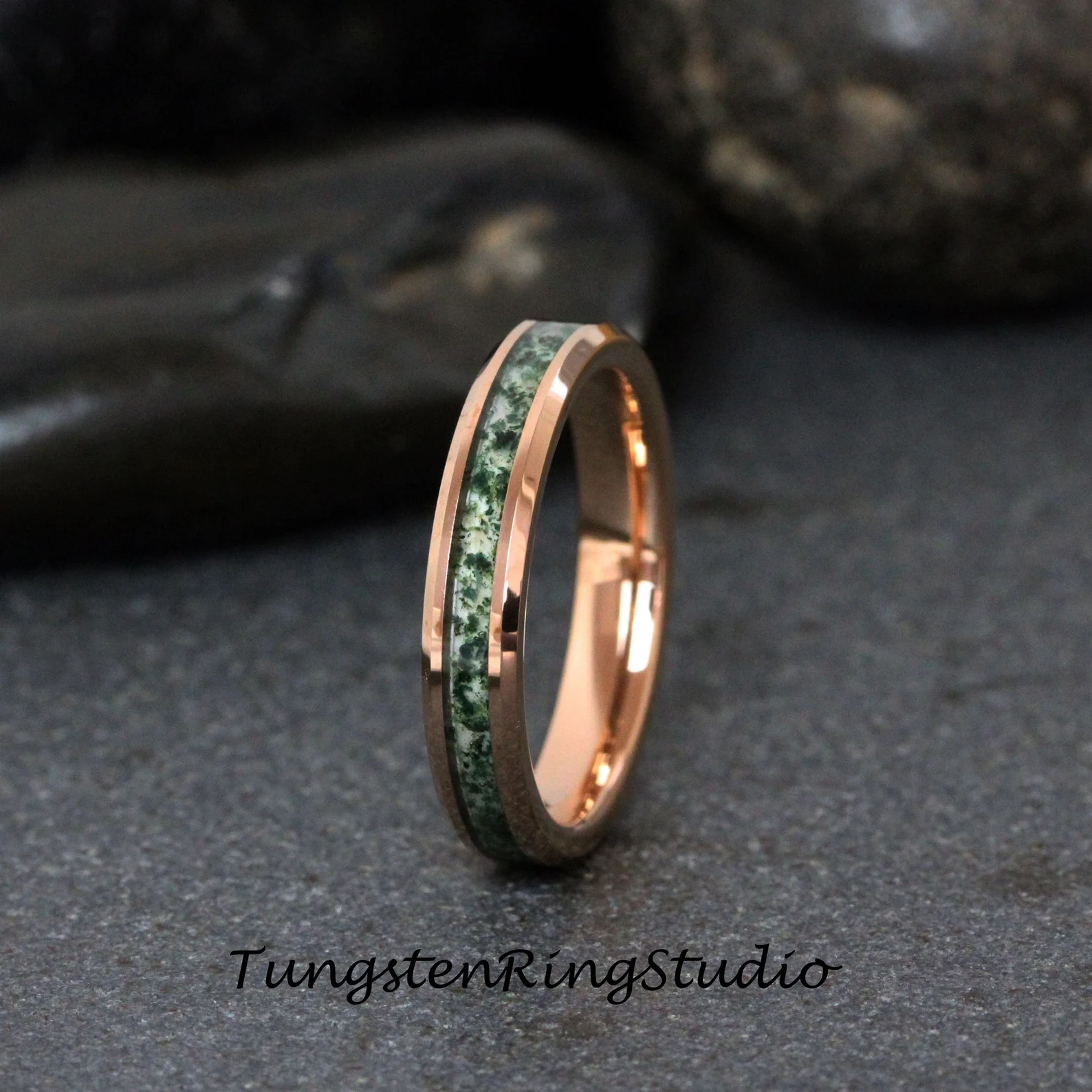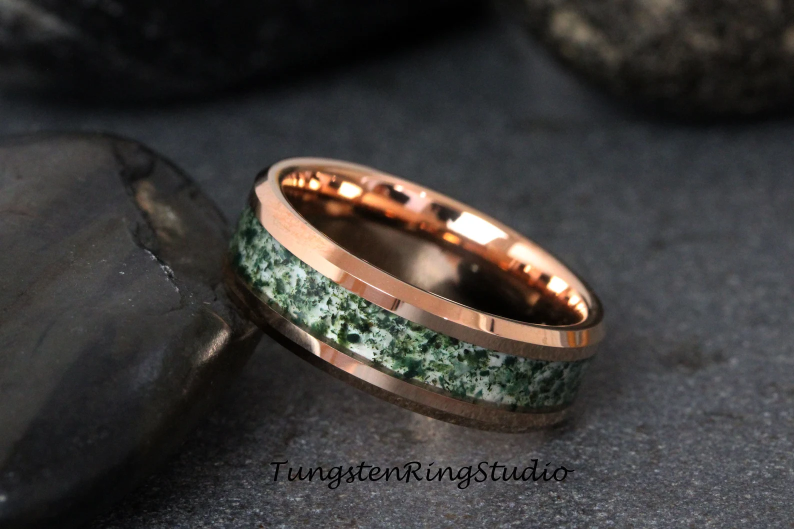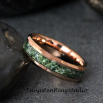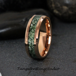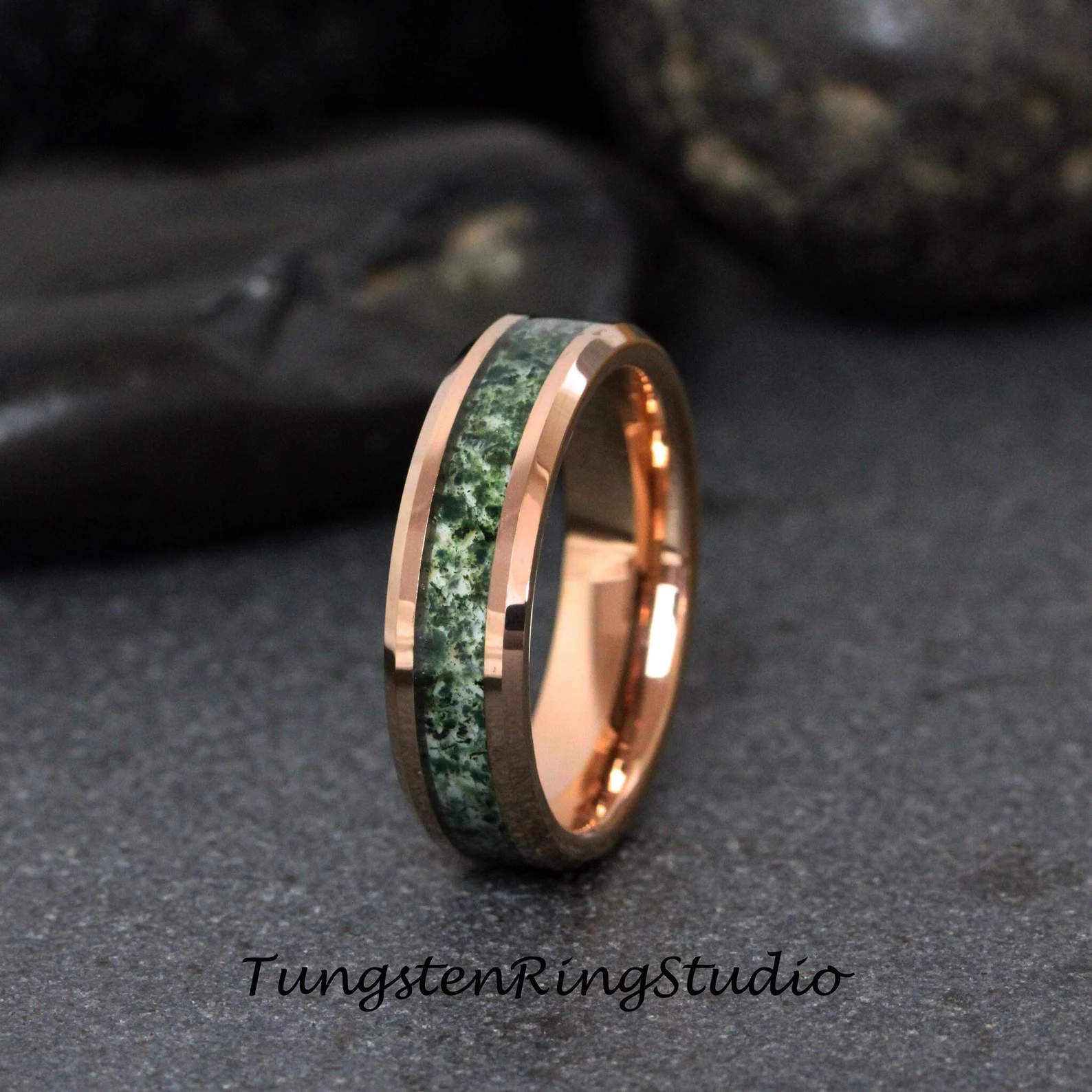 Moss Agate Rose Gold Beveled Tungsten Ring 4mm 6mm 8mm – TungstenRingStudio