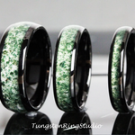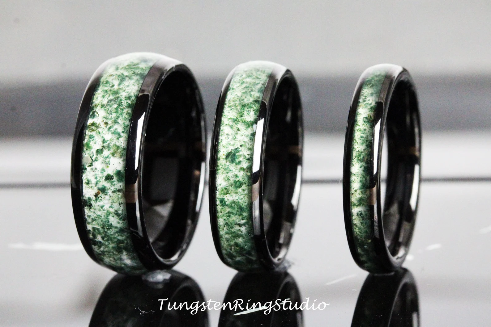 The Moss Agate layer was carefully randomly inlaid over the groove of the tungsten setting, and finally covered with our protective armor layer that shields it from water, dirt, and grime in order to protect the wood and stone inside. The rings look great for every day or on your occasion.