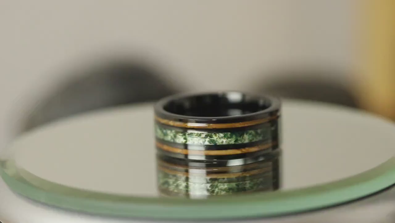 Moss Agate Whiskey Barrel Wood Black Tungsten Carbide Ring 8 mm – TungstenRingStudio