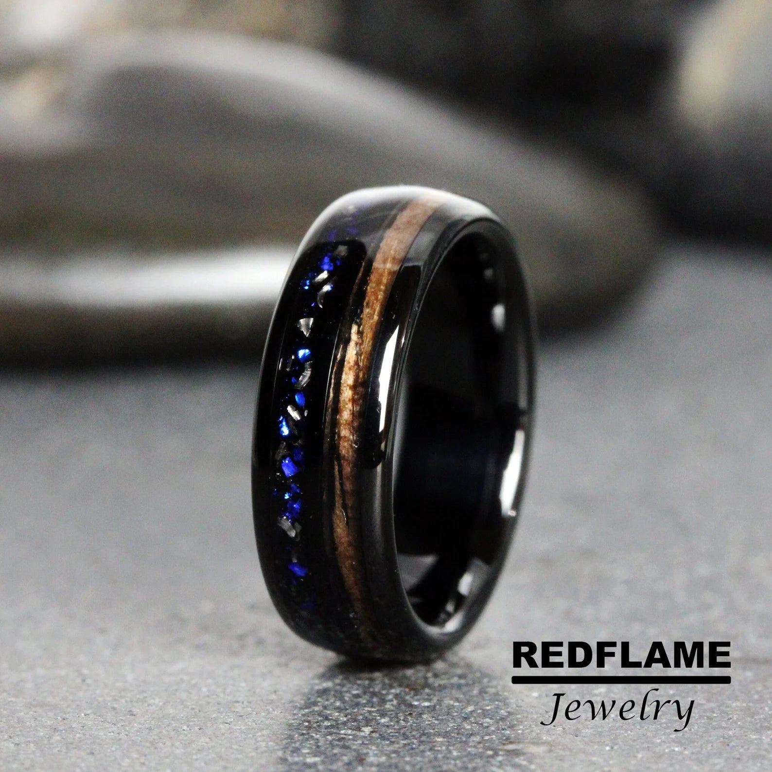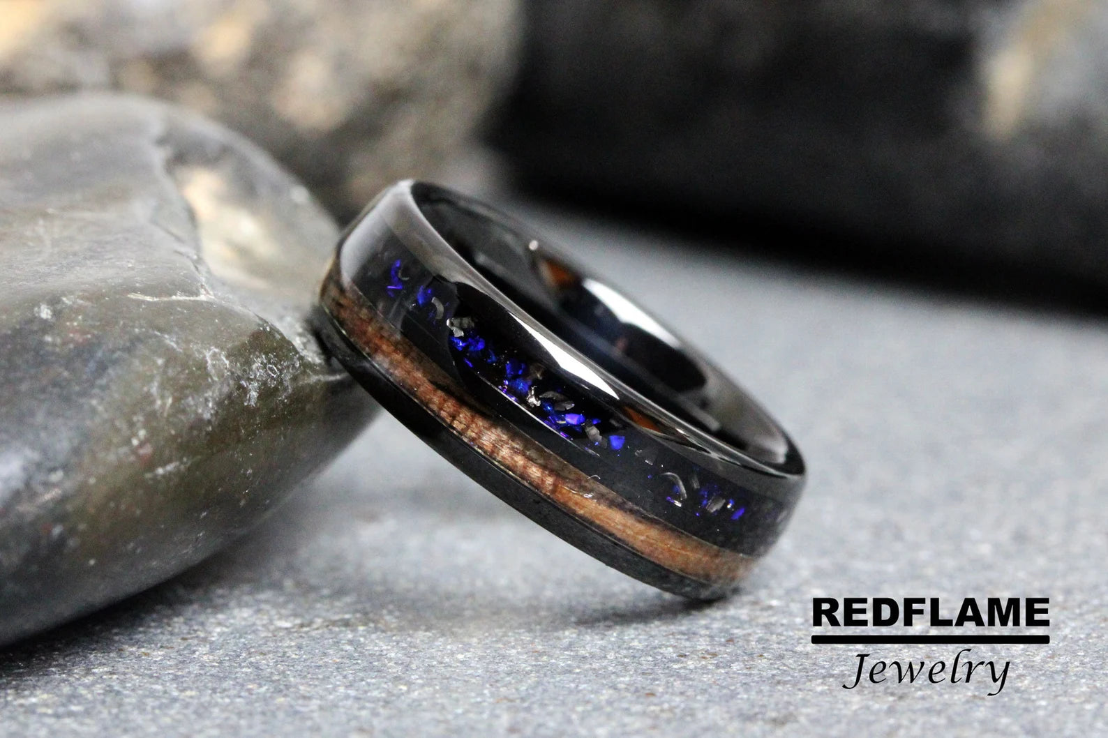 Combo Double Inlay: Nebula Blue Stone Gibeon Meteorite Shaving and Walnut Wood Tungsten Wedding Ring