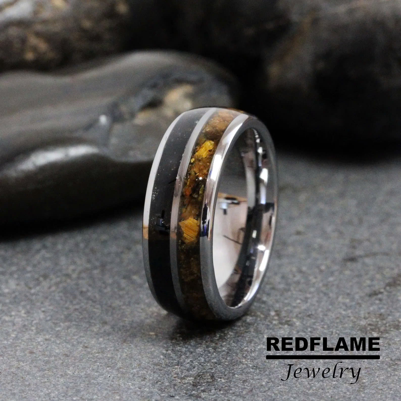 Obsidian Tiger Eye Crushed Silver Gray Tungsten Carbide Rings - Custom – TungstenRingStudio