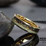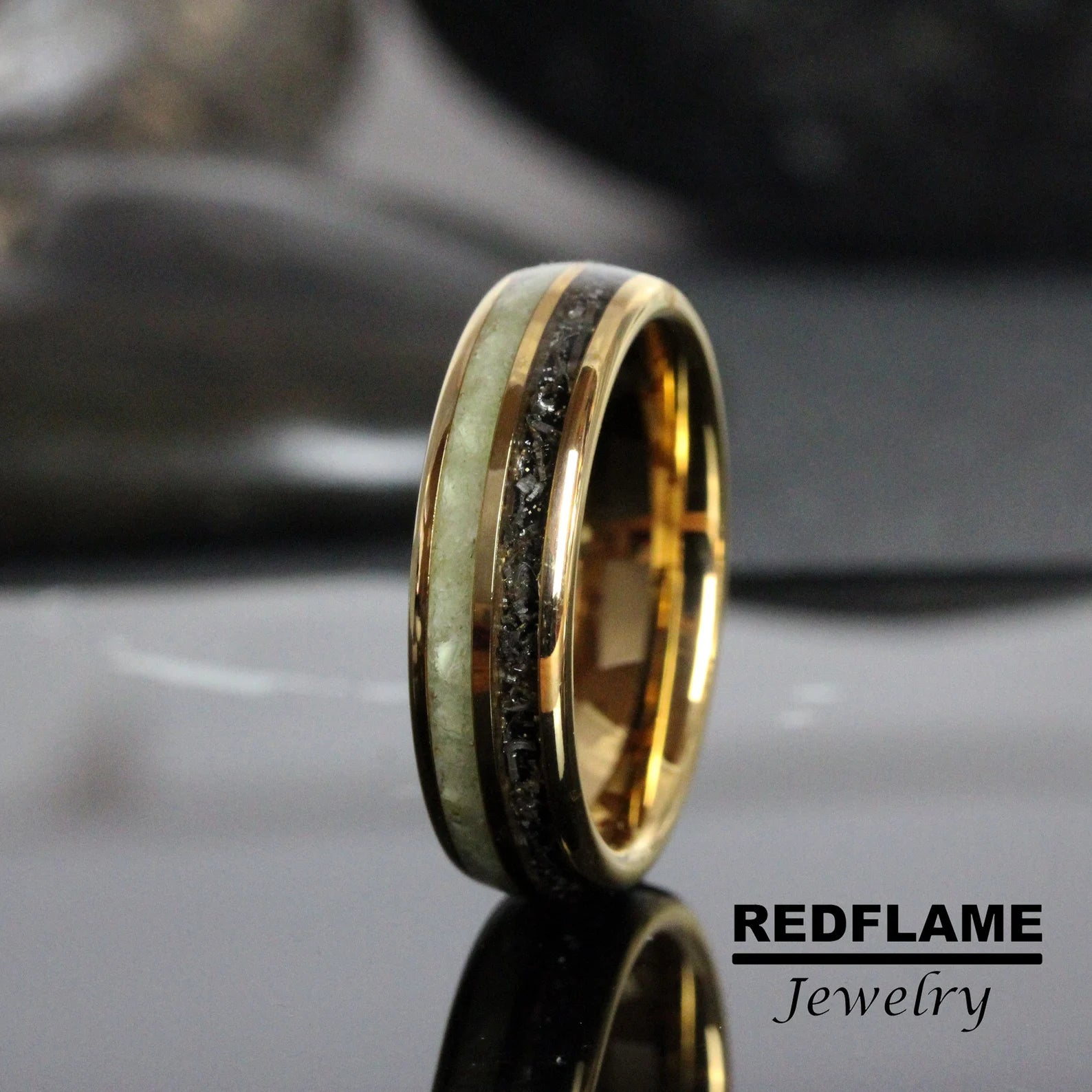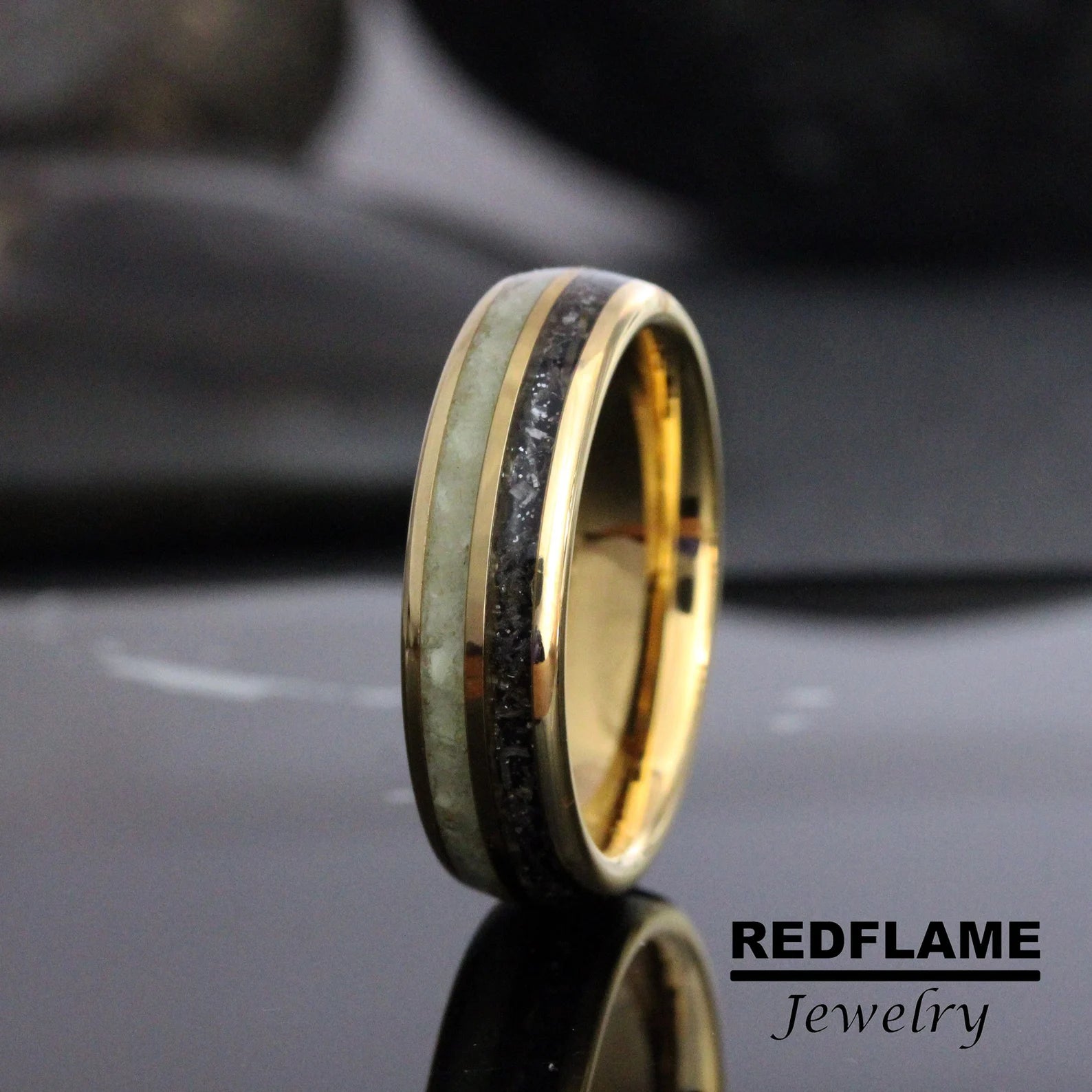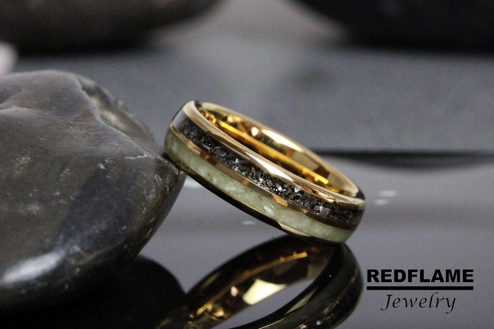 Combo Double Inlay: Natural Crushed Peridot and Gibeon Meteorite Shaving Inlaid over Gold Plating Tungsten Wedding Ring
