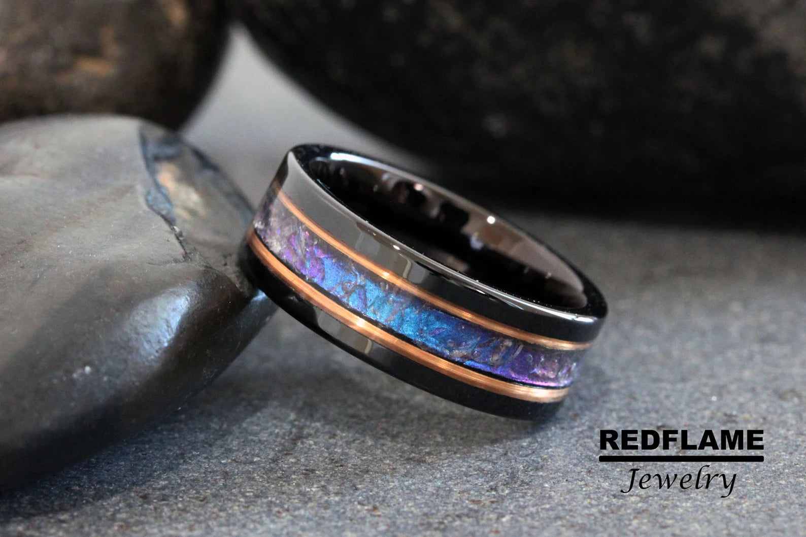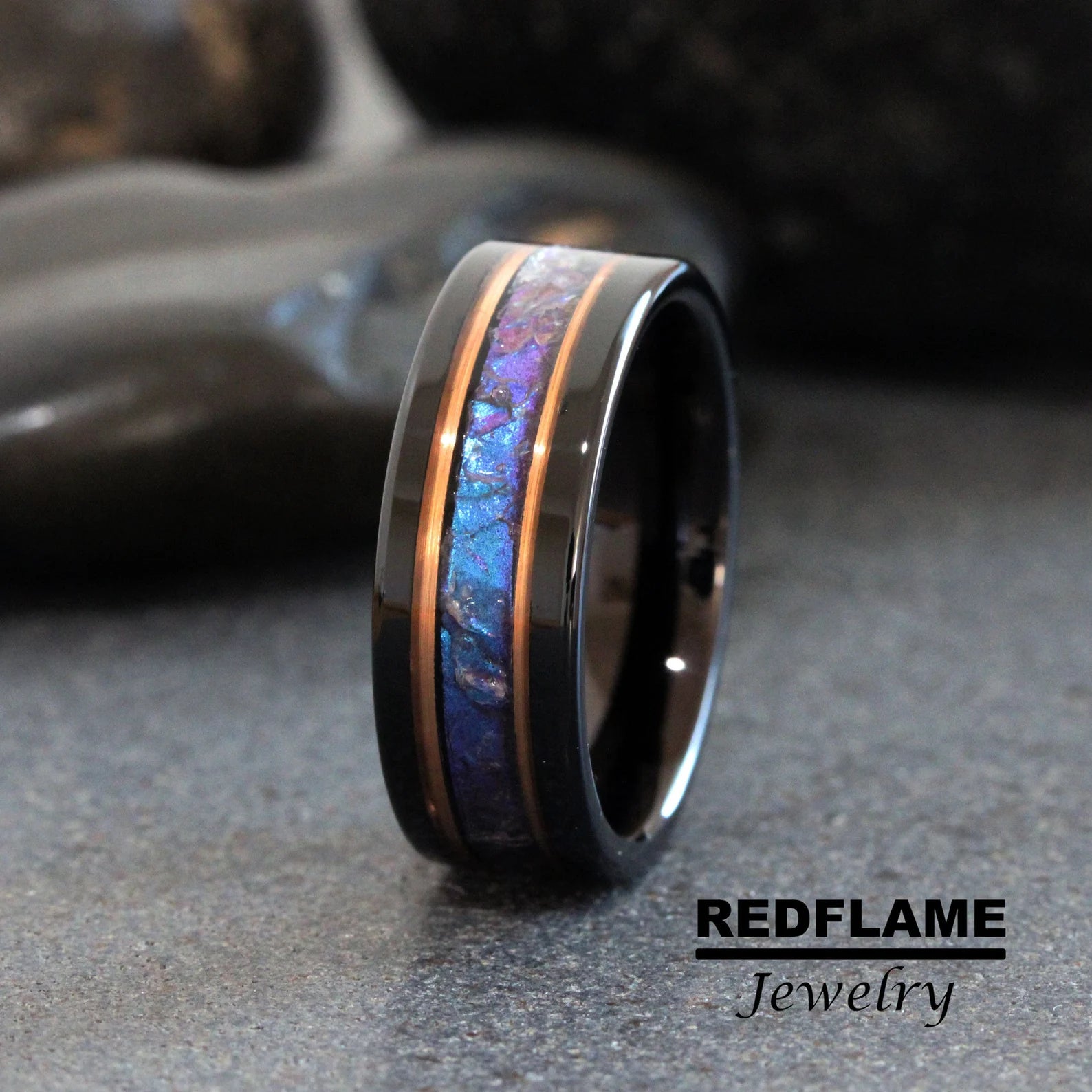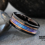 Polish Alexandrite Crushed Wedding Ring, Rose Gold Black 8mm Stripes Accent Changing Color Tungsten Mens Ring Custom Order Blue Purple Stone