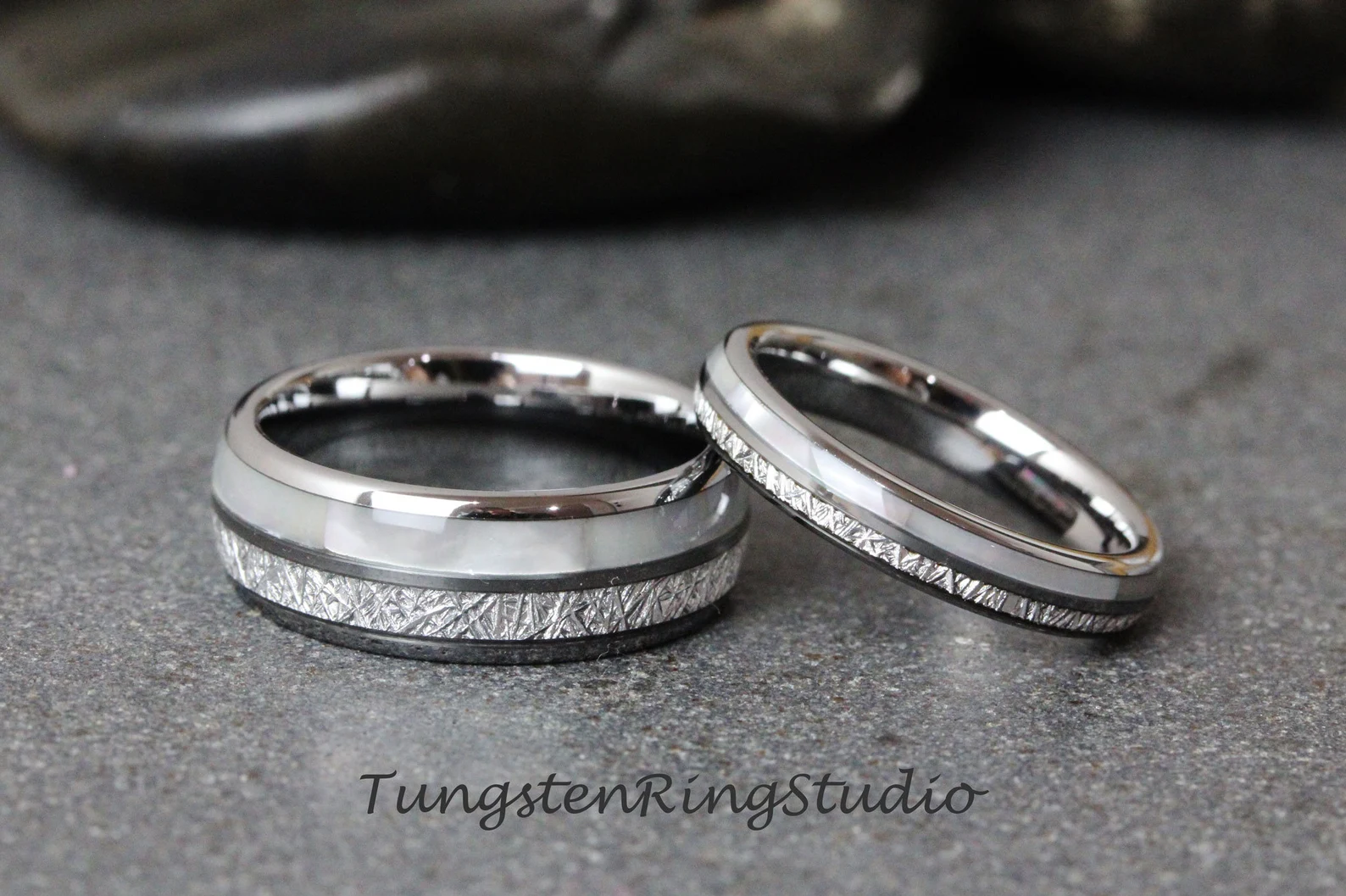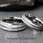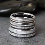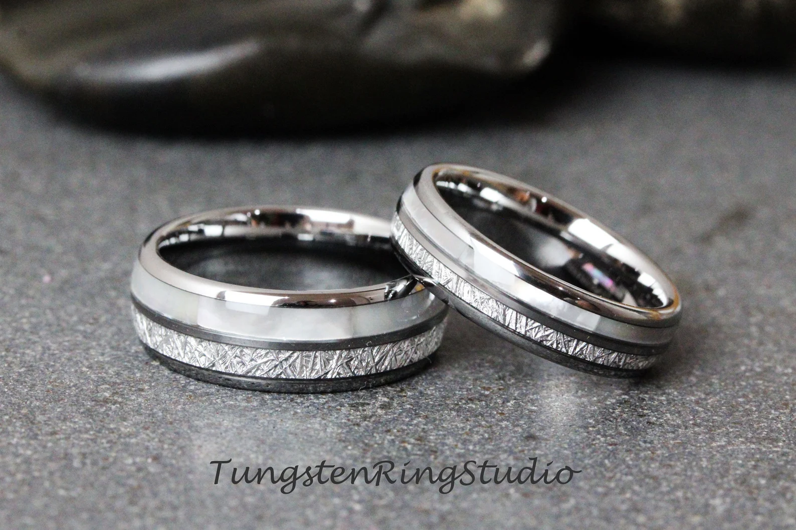 An amazing combination of Natural Mother of Pearl and Imitated Meteorite creates the desired wedding ring, an anniversary ring for couples. The mother of pearl and Meteorite inlaid over the groove of the tungsten setting, and finally covered with our protective armor layer that shields it from water, dirt, and grime in order to protect the inlay inside. The rings look great for every day or on your occasions.