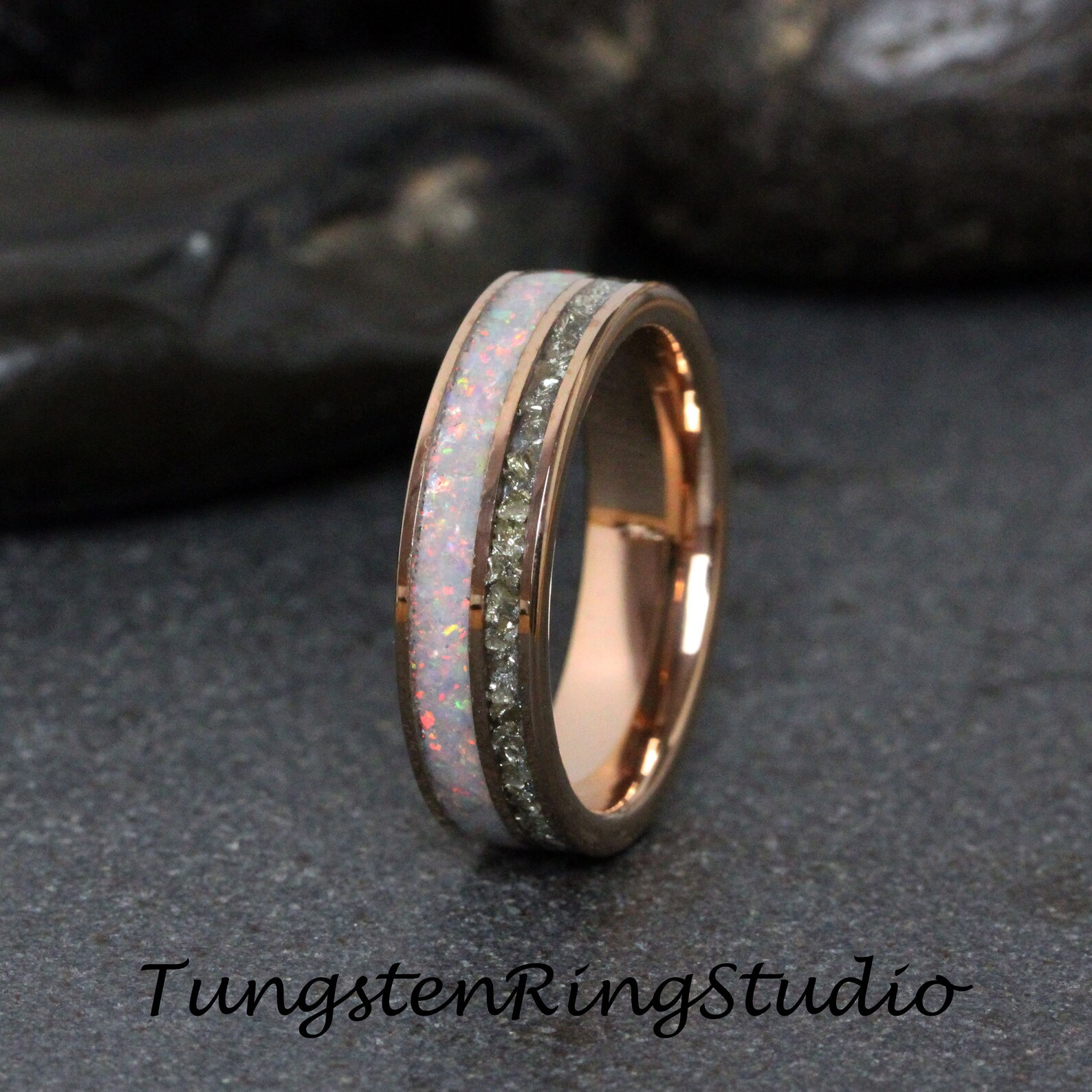 Fire White Opal and Silver German Glass Inlaid Rose Gold Tungsten Carb – TungstenRingStudio