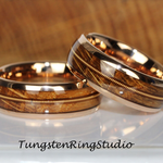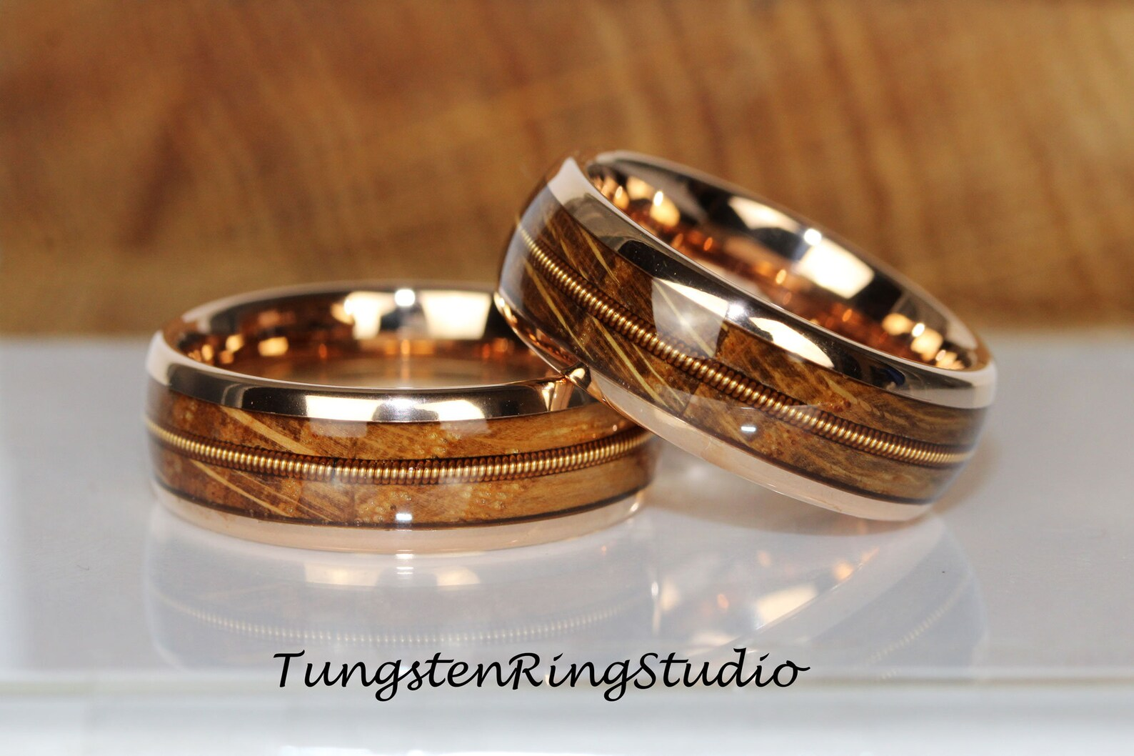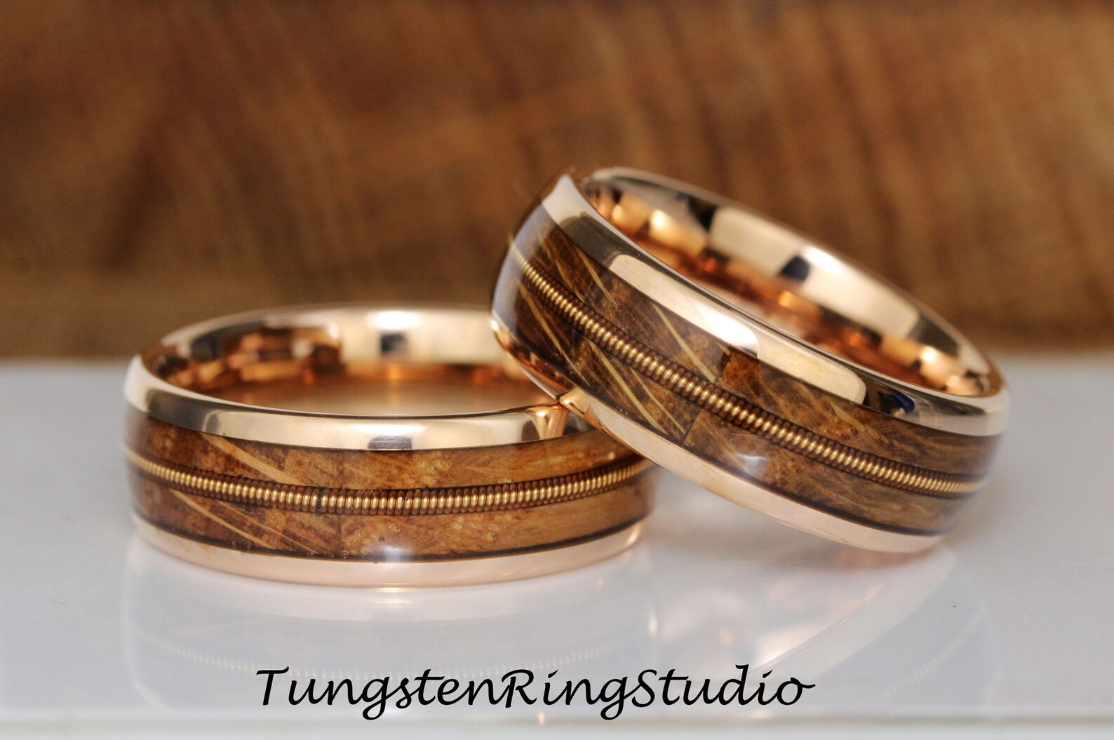 Rose Gold Guitar String Whiskey Barrel Tungsten Wedding Ring Band Match His and Hers Ring Set Mens Ring Wooden Ring Anniversary Ring