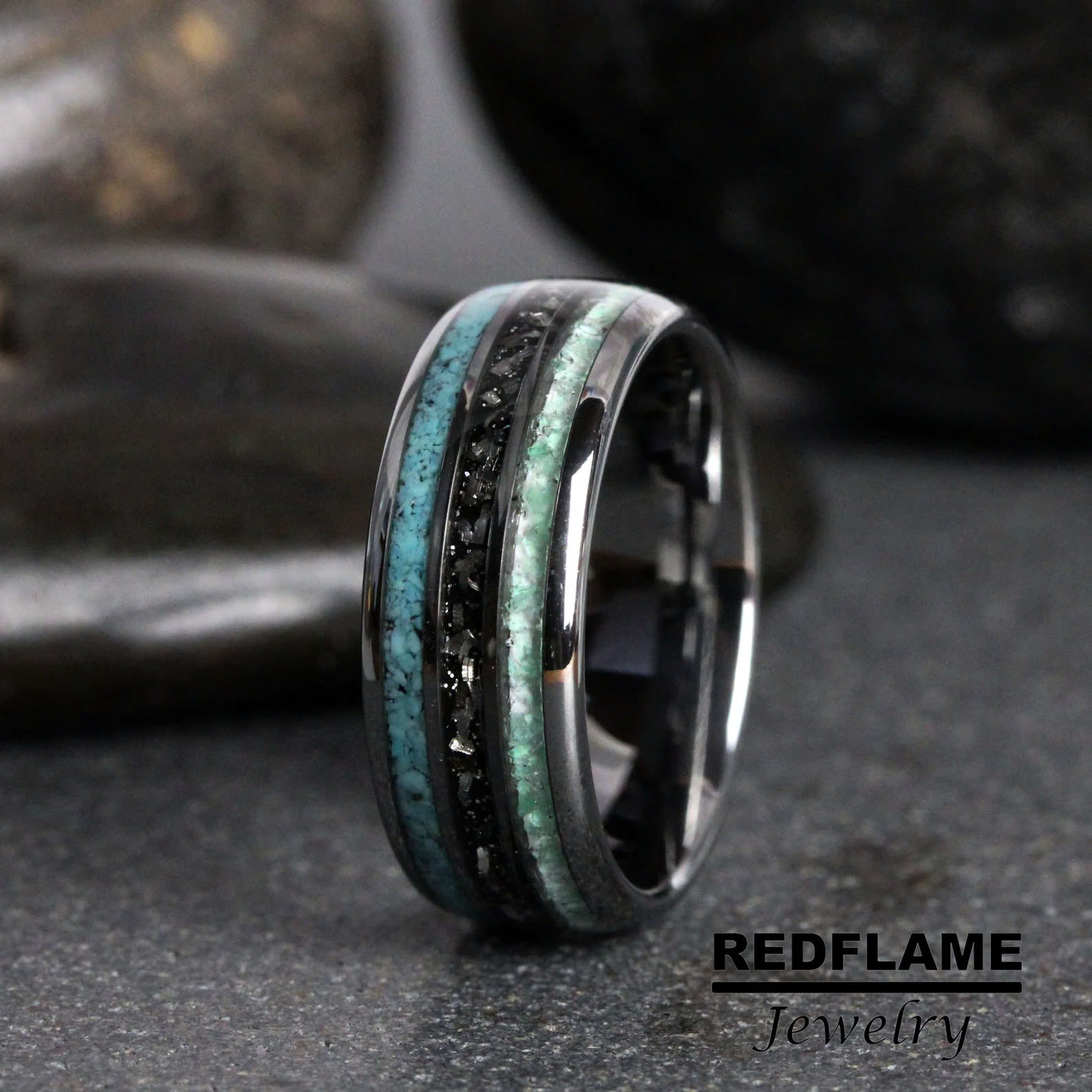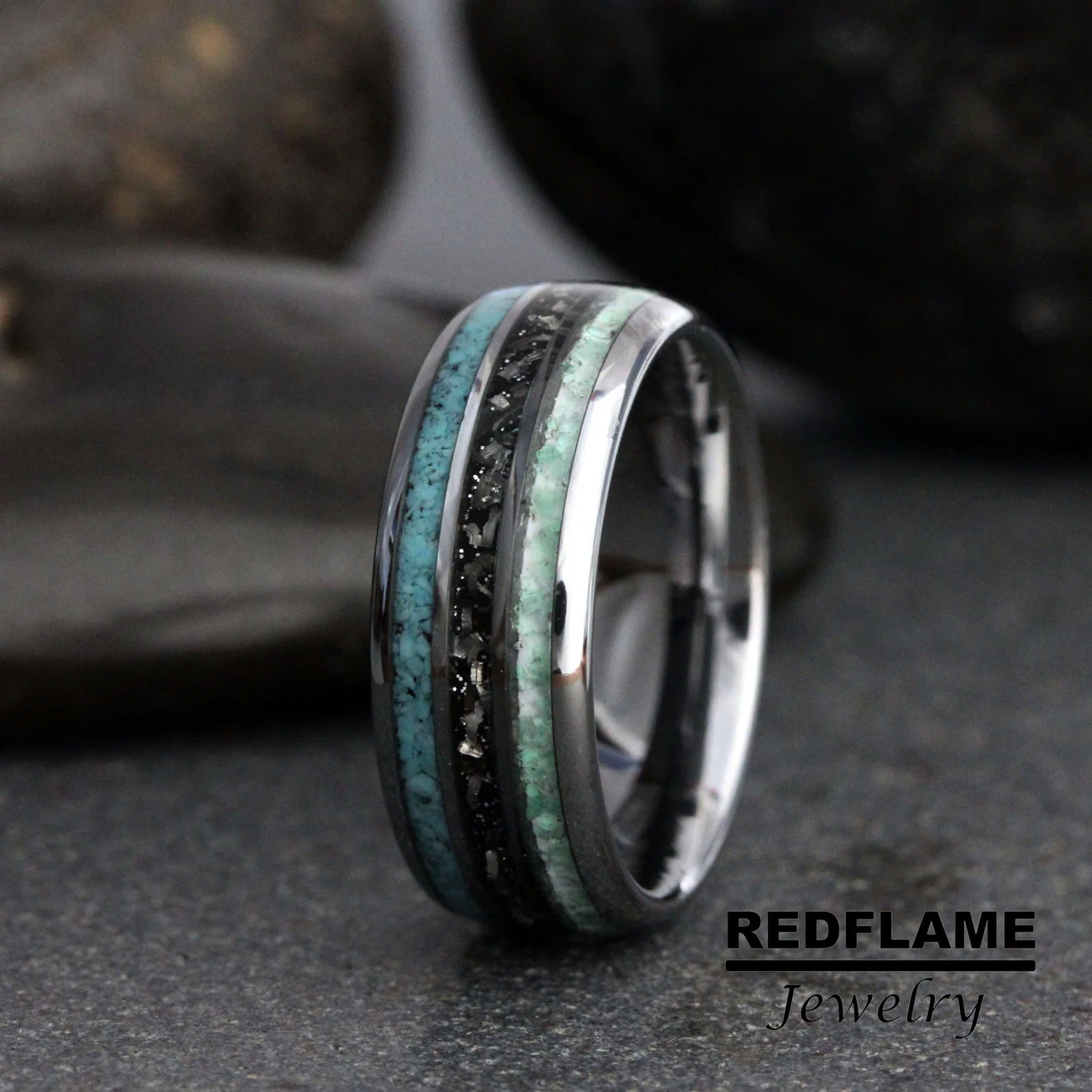 Turquoise Meteorite emerald Silver Gray Tungsten Carbide Ring- Custom – TungstenRingStudio