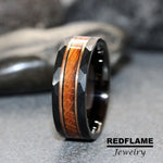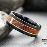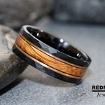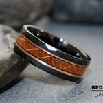 Whiskey Barrel Oak Wood Inlaid over 8mm Black Hammer Rose Gold Strips Tungsten Ring