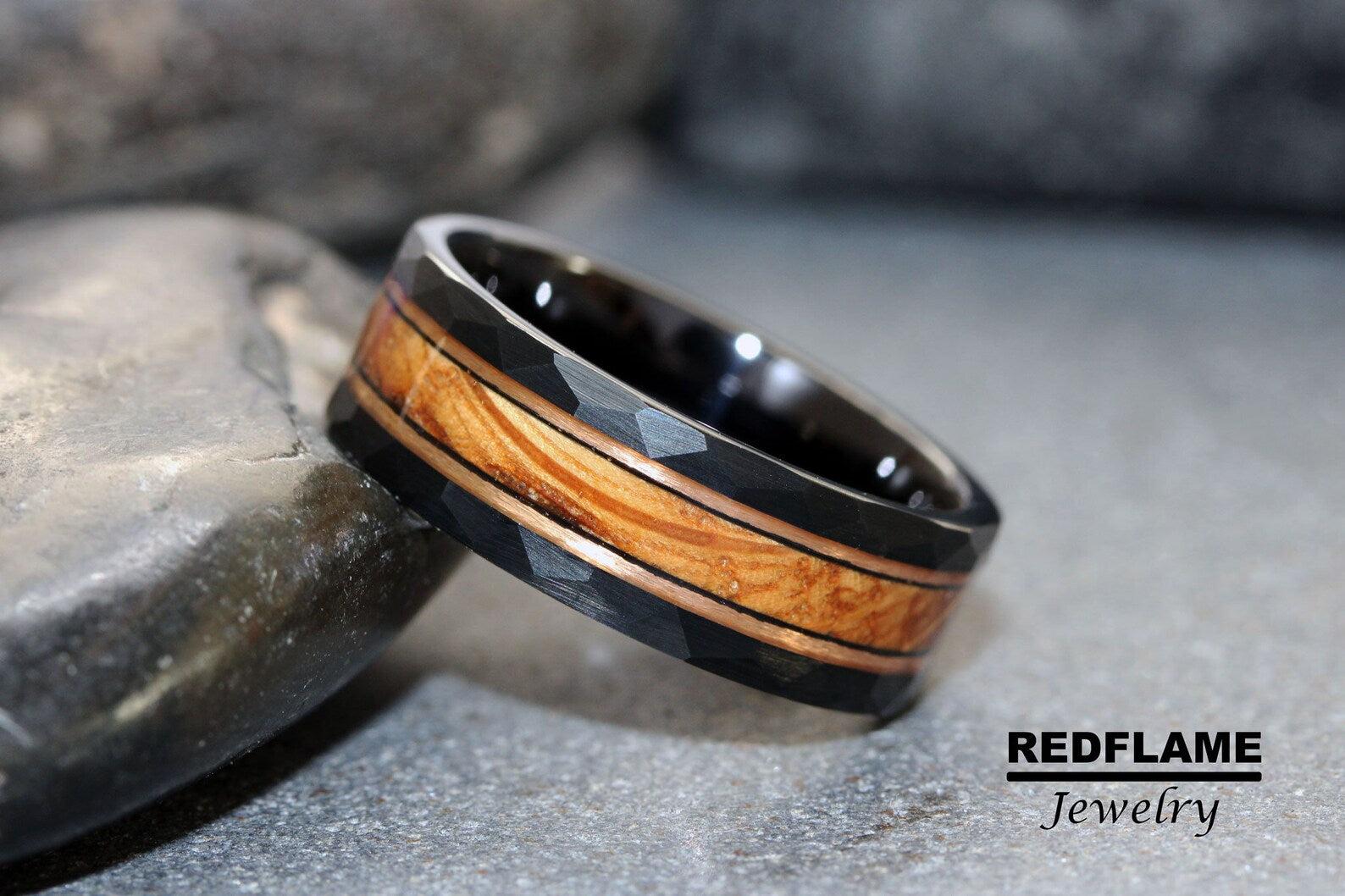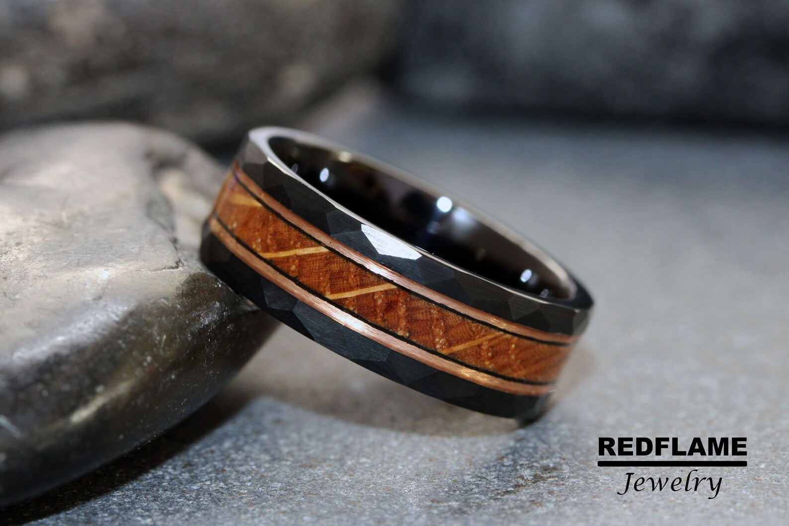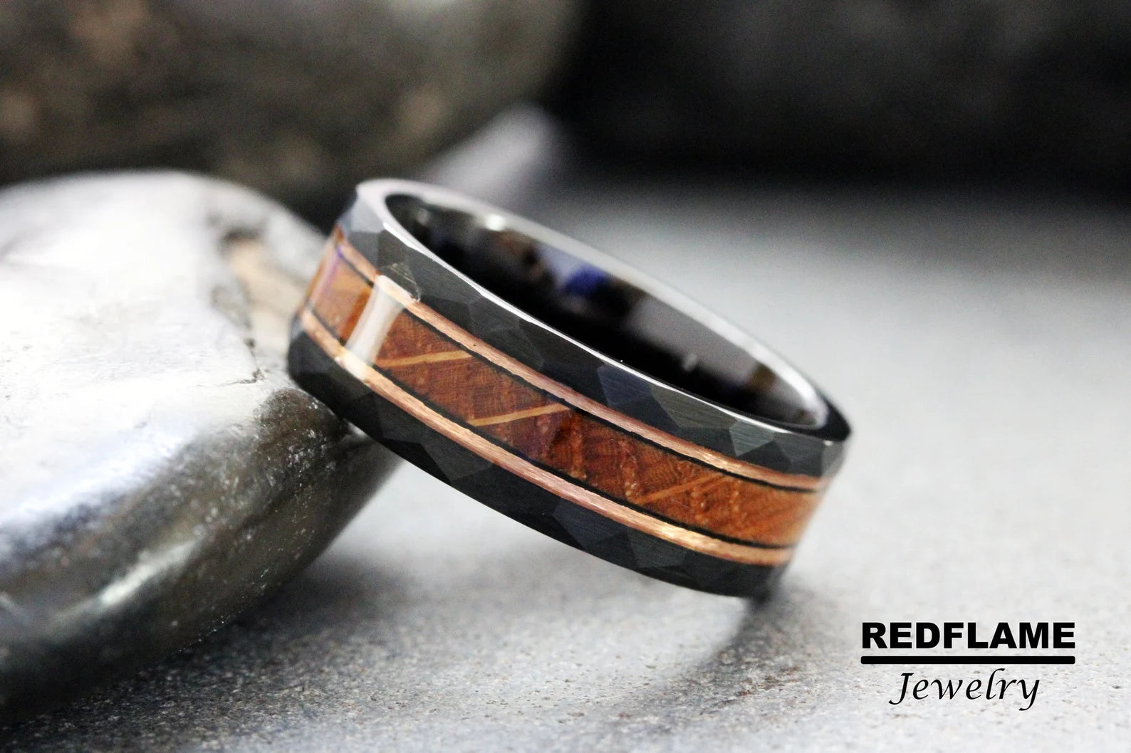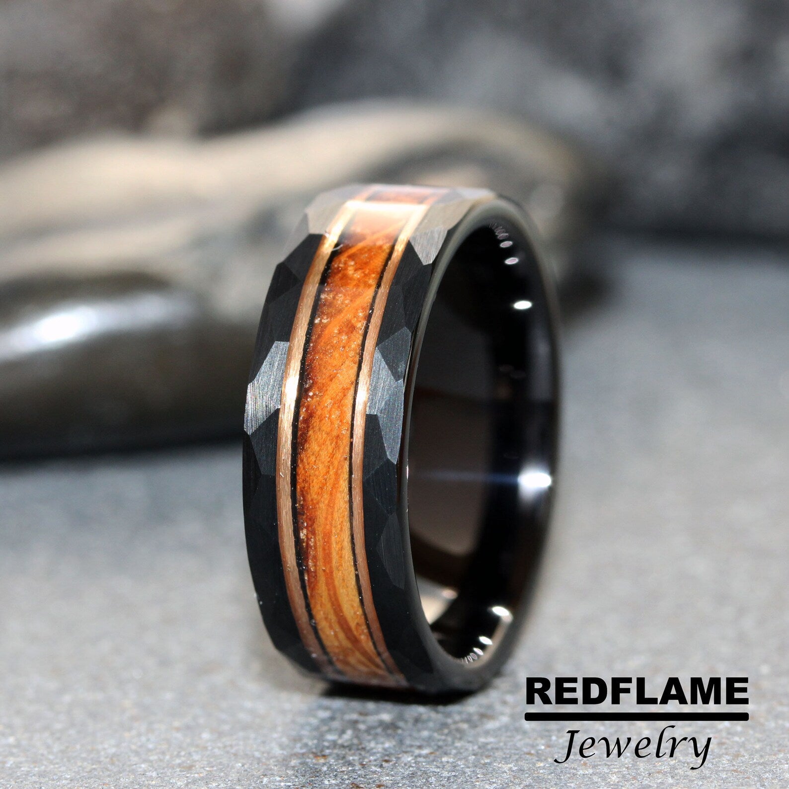 Whiskey Barrel Rose Gold Strips Hammered Tungsten Ring- Custom Order – TungstenRingStudio